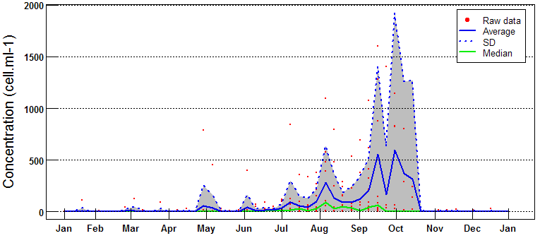 Samples have been collected weekly (weather permitting) from the 10m depth since October 1992, whereby paired 200 mL water samples are fixed in acid Lugol's iodine (Throndsen, 1978) for enumerating all phytoplankton cells > 2µm and neutral formaldehyde for enumerating coccolithophores. Samples are analysed at Plymouth Marine Laboratory according to the Utermohl counting technique (Utermohl, 1958) and since 2016, these methods follow the British and European standard document "Water quality - Guidance standard for routine microscopic surveys of phytoplankton using inverted microscopy (Utermohl technique)" (BS EN 15204:2006).