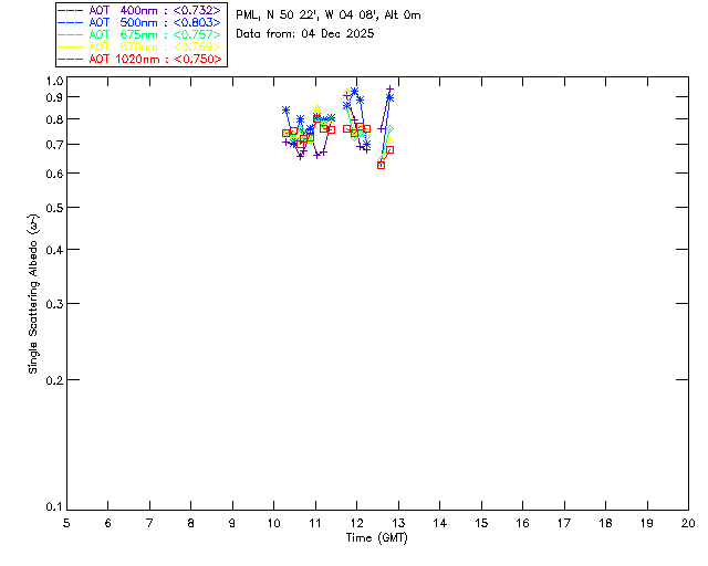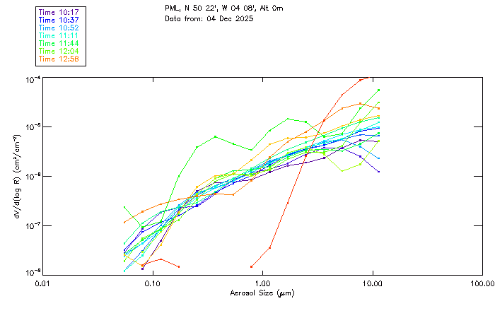 In May 2001 a PREDE POM01-L was installed on the roof of the Plymouth Marine Laboratory to continue the atmospheric correction research of the PML Remote Sensing Group. This was to replace the AERONET CIMEL sunphotometer situated at Rame Head which was decommissioned in 1999. The instrument operates at 7 wavelengths (315, 400, 500, 670, 870, 940 and 1020nm) and scans at pre-set angles away from the solar disk to determine, using the inversion code of Nakajima et al. (2006), various properties of tiny particles called aerosols within the atmospheric column. From these measurements useful atmospheric aerosol parameters such as the Aerosol Optical Thickness (AOT), aerosol size distribution and single scattering albedo can be calculated. Marine aerosols tend to be bigger (D > 1µm) than those generated over the land (0.01 < D < 1µm) and are of a different chemical composition; marine aerosols are salt particles whereas terrestrial aerosols are sulphate compounds.