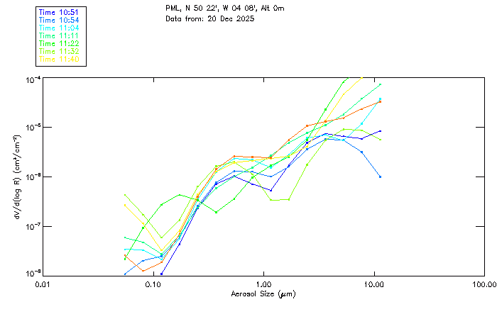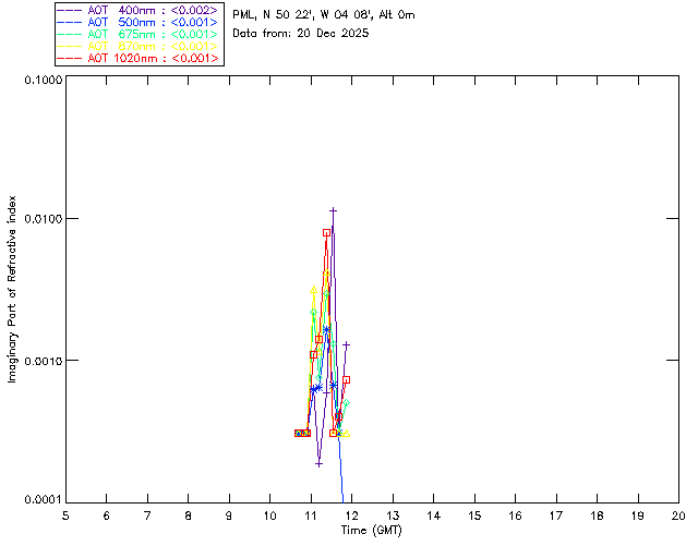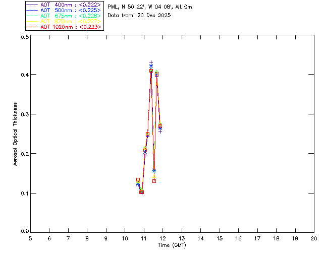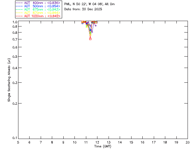 In May 2001 a PREDE POM01-L was installed on the roof of the Plymouth Marine Laboratory to continue the atmospheric correction research of the PML Remote Sensing Group. This was to replace the AERONET CIMEL sunphotometer situated at Rame Head which was decommissioned in 1999. The instrument operates at 7 wavelengths (315, 400, 500, 670, 870, 940 and 1020nm) and scans at pre-set angles away from the solar disk to determine, using the inversion code of Nakajima et al. (2006), various properties of tiny particles called aerosols within the atmospheric column. From these measurements useful atmospheric aerosol parameters such as the Aerosol Optical Thickness (AOT), aerosol size distribution and single scattering albedo can be calculated. Marine aerosols tend to be bigger (D > 1µm) than those generated over the land (0.01 < D < 1µm) and are of a different chemical composition; marine aerosols are salt particles whereas terrestrial aerosols are sulphate compounds.