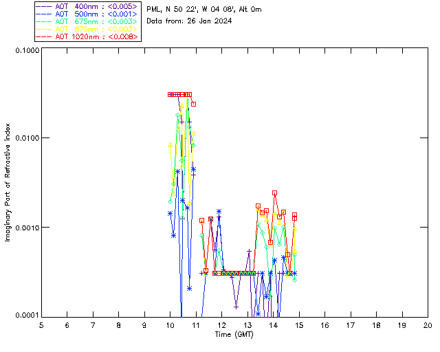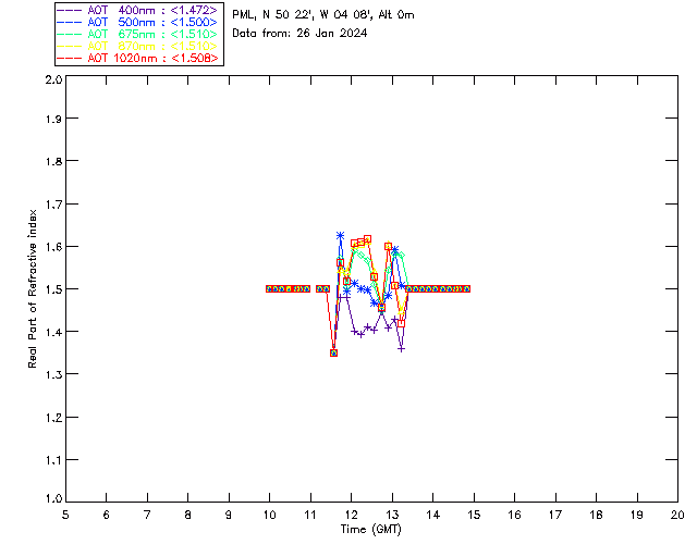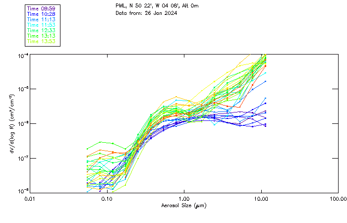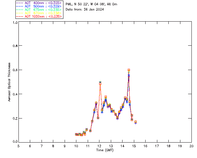 In May 2001 a PREDE POM01-L was installed on the roof of the Plymouth Marine Laboratory to continue the atmospheric correction research of the PML Remote Sensing Group. This was to replace the AERONET CIMEL sunphotometer situated at Rame Head which was decommissioned in 1999. The instrument operates at 7 wavelengths (315, 400, 500, 670, 870, 940 and 1020nm) and scans at pre-set angles away from the solar disk to determine, using the inversion code of Nakajima et al. (2006), various properties of tiny particles called aerosols within the atmospheric column. From these measurements useful atmospheric aerosol parameters such as the Aerosol Optical Thickness (AOT), aerosol size distribution and single scattering albedo can be calculated. Marine aerosols tend to be bigger (D > 1µm) than those generated over the land (0.01 < D < 1µm) and are of a different chemical composition; marine aerosols are salt particles whereas terrestrial aerosols are sulphate compounds.