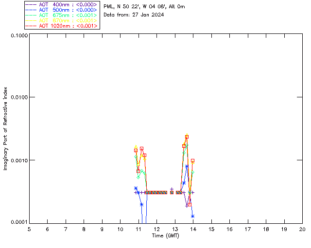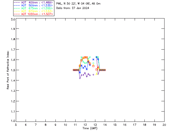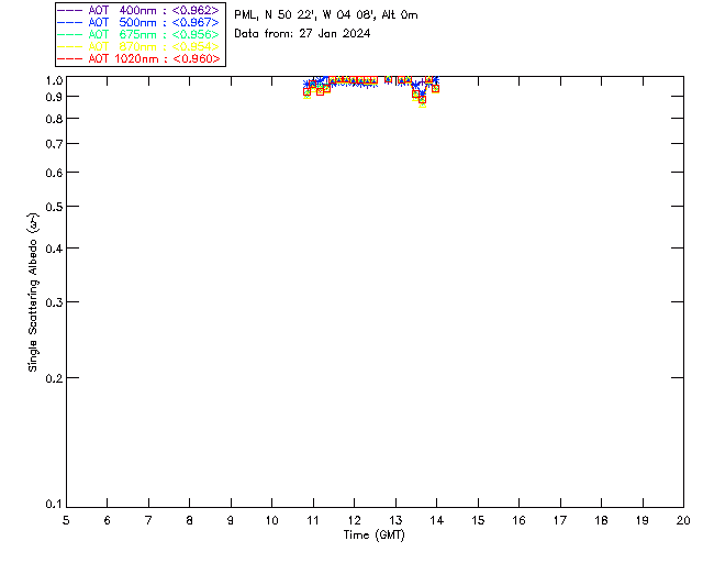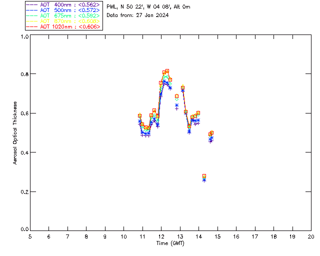 In May 2001 a PREDE POM01-L was installed on the roof of the Plymouth Marine Laboratory to continue the atmospheric correction research of the PML Remote Sensing Group. This was to replace the AERONET CIMEL sunphotometer situated at Rame Head which was decommissioned in 1999. The instrument operates at 7 wavelengths (315, 400, 500, 670, 870, 940 and 1020nm) and scans at pre-set angles away from the solar disk to determine, using the inversion code of Nakajima et al. (2006), various properties of tiny particles called aerosols within the atmospheric column. From these measurements useful atmospheric aerosol parameters such as the Aerosol Optical Thickness (AOT), aerosol size distribution and single scattering albedo can be calculated. Marine aerosols tend to be bigger (D > 1µm) than those generated over the land (0.01 < D < 1µm) and are of a different chemical composition; marine aerosols are salt particles whereas terrestrial aerosols are sulphate compounds.