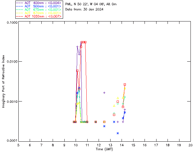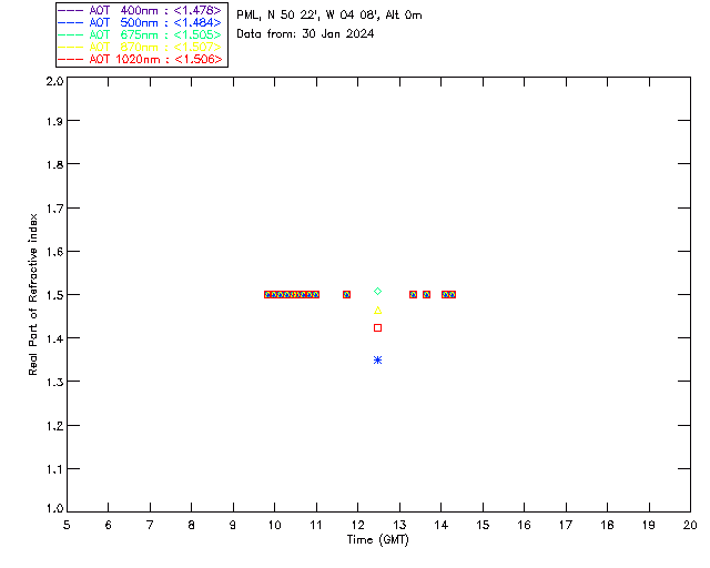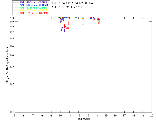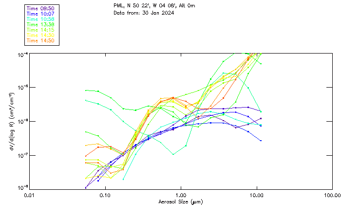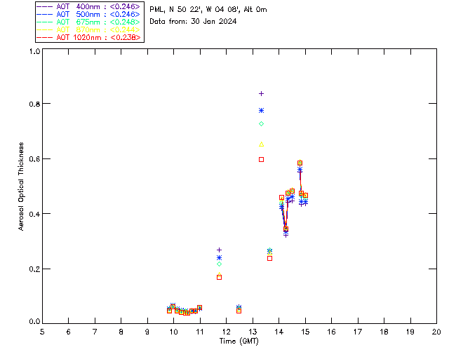 In May 2001 a PREDE POM01-L was installed on the roof of the Plymouth Marine Laboratory to continue the atmospheric correction research of the PML Remote Sensing Group. This was to replace the AERONET CIMEL sunphotometer situated at Rame Head which was decommissioned in 1999. The instrument operates at 7 wavelengths (315, 400, 500, 670, 870, 940 and 1020nm) and scans at pre-set angles away from the solar disk to determine, using the inversion code of Nakajima et al. (2006), various properties of tiny particles called aerosols within the atmospheric column. From these measurements useful atmospheric aerosol parameters such as the Aerosol Optical Thickness (AOT), aerosol size distribution and single scattering albedo can be calculated. Marine aerosols tend to be bigger (D > 1µm) than those generated over the land (0.01 < D < 1µm) and are of a different chemical composition; marine aerosols are salt particles whereas terrestrial aerosols are sulphate compounds.