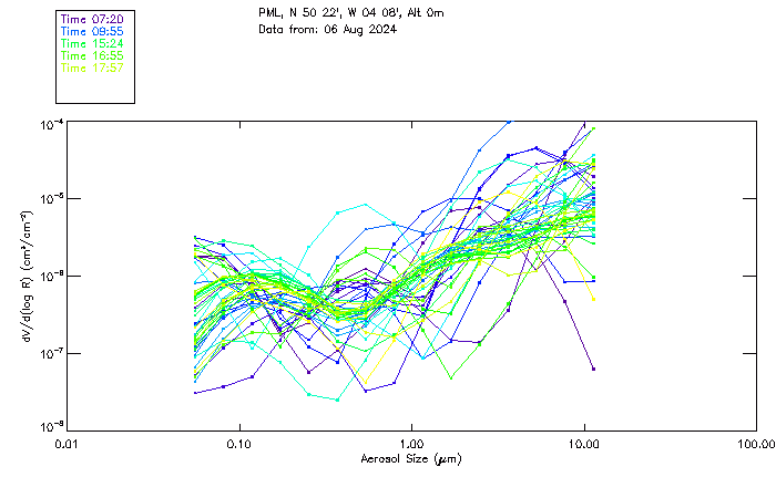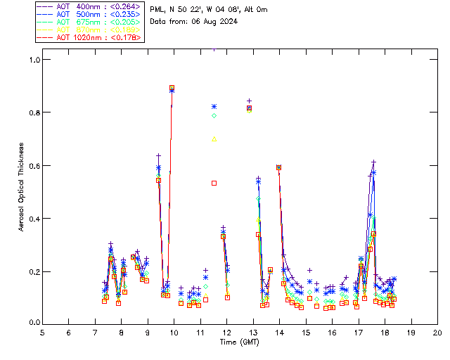 In May 2001 a PREDE POM01-L was installed on the roof of the Plymouth Marine Laboratory to continue the atmospheric correction research of the PML Remote Sensing Group. This was to replace the AERONET CIMEL sunphotometer situated at Rame Head which was decommissioned in 1999. The instrument operates at 7 wavelengths (315, 400, 500, 670, 870, 940 and 1020nm) and scans at pre-set angles away from the solar disk to determine, using the inversion code of Nakajima et al. (2006), various properties of tiny particles called aerosols within the atmospheric column. From these measurements useful atmospheric aerosol parameters such as the Aerosol Optical Thickness (AOT), aerosol size distribution and single scattering albedo can be calculated. Marine aerosols tend to be bigger (D > 1µm) than those generated over the land (0.01 < D < 1µm) and are of a different chemical composition; marine aerosols are salt particles whereas terrestrial aerosols are sulphate compounds.