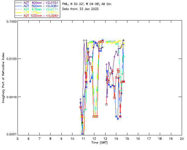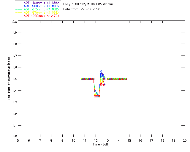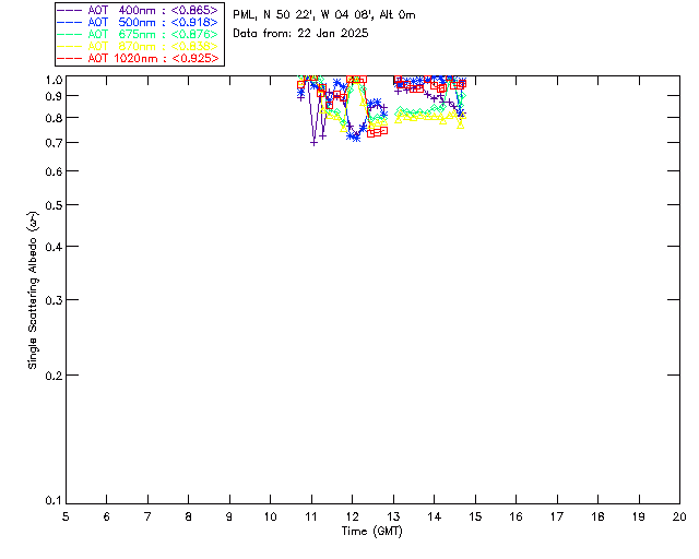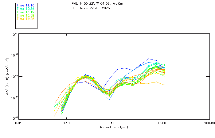 In May 2001 a PREDE POM01-L was installed on the roof of the Plymouth Marine Laboratory to continue the atmospheric correction research of the PML Remote Sensing Group. This was to replace the AERONET CIMEL sunphotometer situated at Rame Head which was decommissioned in 1999. The instrument operates at 7 wavelengths (315, 400, 500, 670, 870, 940 and 1020nm) and scans at pre-set angles away from the solar disk to determine, using the inversion code of Nakajima et al. (2006), various properties of tiny particles called aerosols within the atmospheric column. From these measurements useful atmospheric aerosol parameters such as the Aerosol Optical Thickness (AOT), aerosol size distribution and single scattering albedo can be calculated. Marine aerosols tend to be bigger (D > 1µm) than those generated over the land (0.01 < D < 1µm) and are of a different chemical composition; marine aerosols are salt particles whereas terrestrial aerosols are sulphate compounds.