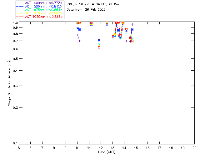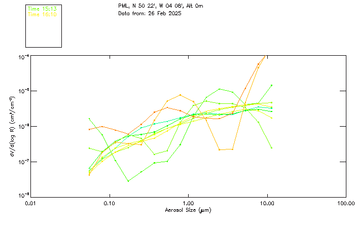 In May 2001 a PREDE POM01-L was installed on the roof of the Plymouth Marine Laboratory to continue the atmospheric correction research of the PML Remote Sensing Group. This was to replace the AERONET CIMEL sunphotometer situated at Rame Head which was decommissioned in 1999. The instrument operates at 7 wavelengths (315, 400, 500, 670, 870, 940 and 1020nm) and scans at pre-set angles away from the solar disk to determine, using the inversion code of Nakajima et al. (2006), various properties of tiny particles called aerosols within the atmospheric column. From these measurements useful atmospheric aerosol parameters such as the Aerosol Optical Thickness (AOT), aerosol size distribution and single scattering albedo can be calculated. Marine aerosols tend to be bigger (D > 1µm) than those generated over the land (0.01 < D < 1µm) and are of a different chemical composition; marine aerosols are salt particles whereas terrestrial aerosols are sulphate compounds.