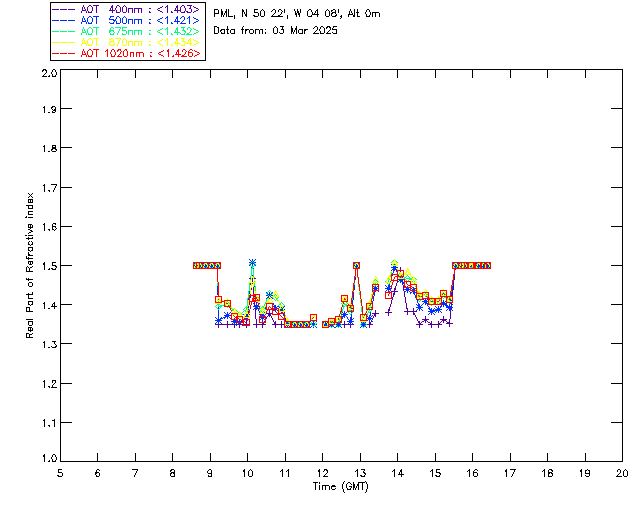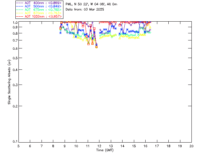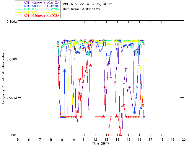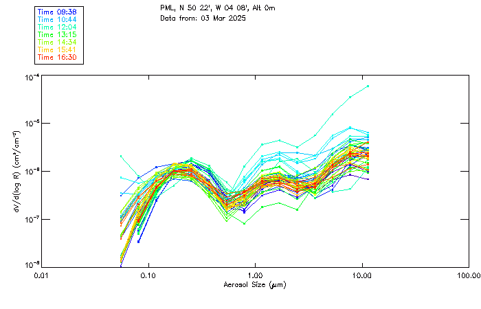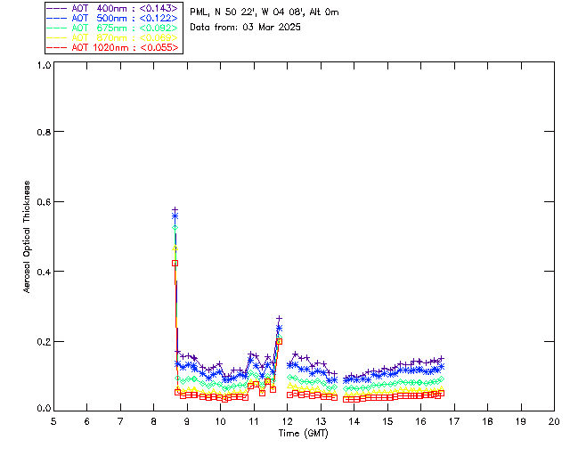 In May 2001 a PREDE POM01-L was installed on the roof of the Plymouth Marine Laboratory to continue the atmospheric correction research of the PML Remote Sensing Group. This was to replace the AERONET CIMEL sunphotometer situated at Rame Head which was decommissioned in 1999. The instrument operates at 7 wavelengths (315, 400, 500, 670, 870, 940 and 1020nm) and scans at pre-set angles away from the solar disk to determine, using the inversion code of Nakajima et al. (2006), various properties of tiny particles called aerosols within the atmospheric column. From these measurements useful atmospheric aerosol parameters such as the Aerosol Optical Thickness (AOT), aerosol size distribution and single scattering albedo can be calculated. Marine aerosols tend to be bigger (D > 1µm) than those generated over the land (0.01 < D < 1µm) and are of a different chemical composition; marine aerosols are salt particles whereas terrestrial aerosols are sulphate compounds.