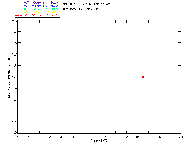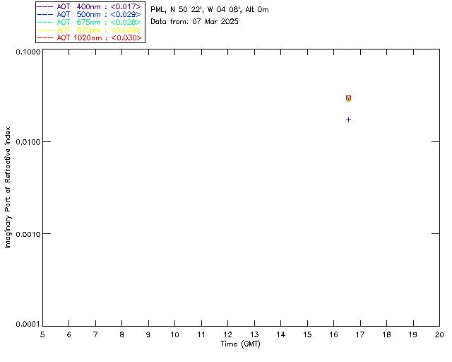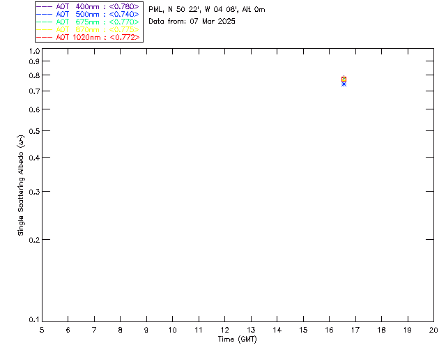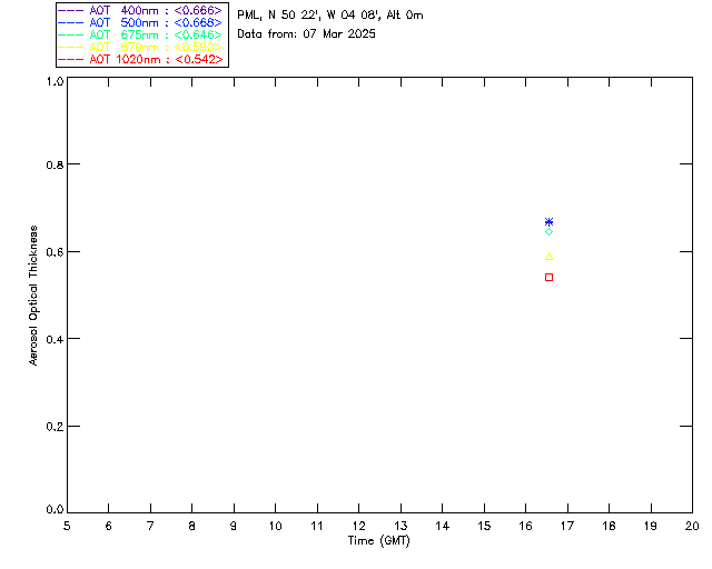 In May 2001 a PREDE POM01-L was installed on the roof of the Plymouth Marine Laboratory to continue the atmospheric correction research of the PML Remote Sensing Group. This was to replace the AERONET CIMEL sunphotometer situated at Rame Head which was decommissioned in 1999. The instrument operates at 7 wavelengths (315, 400, 500, 670, 870, 940 and 1020nm) and scans at pre-set angles away from the solar disk to determine, using the inversion code of Nakajima et al. (2006), various properties of tiny particles called aerosols within the atmospheric column. From these measurements useful atmospheric aerosol parameters such as the Aerosol Optical Thickness (AOT), aerosol size distribution and single scattering albedo can be calculated. Marine aerosols tend to be bigger (D > 1µm) than those generated over the land (0.01 < D < 1µm) and are of a different chemical composition; marine aerosols are salt particles whereas terrestrial aerosols are sulphate compounds.