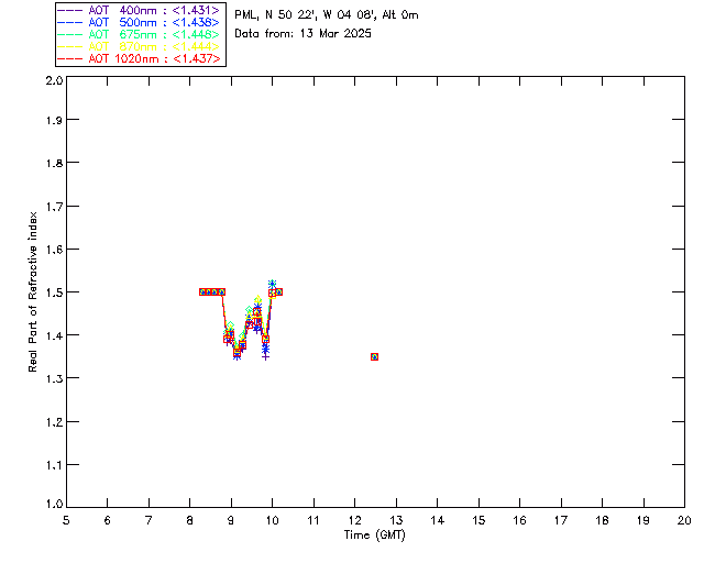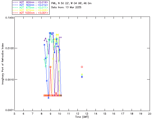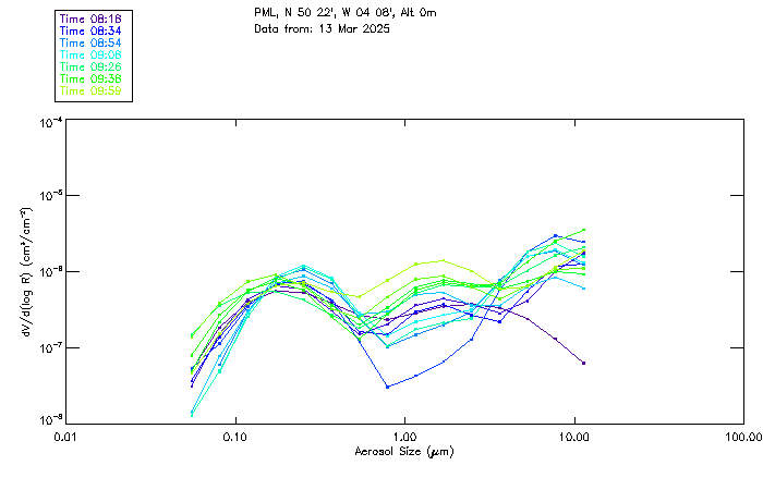 In May 2001 a PREDE POM01-L was installed on the roof of the Plymouth Marine Laboratory to continue the atmospheric correction research of the PML Remote Sensing Group. This was to replace the AERONET CIMEL sunphotometer situated at Rame Head which was decommissioned in 1999. The instrument operates at 7 wavelengths (315, 400, 500, 670, 870, 940 and 1020nm) and scans at pre-set angles away from the solar disk to determine, using the inversion code of Nakajima et al. (2006), various properties of tiny particles called aerosols within the atmospheric column. From these measurements useful atmospheric aerosol parameters such as the Aerosol Optical Thickness (AOT), aerosol size distribution and single scattering albedo can be calculated. Marine aerosols tend to be bigger (D > 1µm) than those generated over the land (0.01 < D < 1µm) and are of a different chemical composition; marine aerosols are salt particles whereas terrestrial aerosols are sulphate compounds.