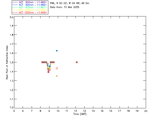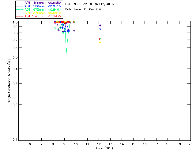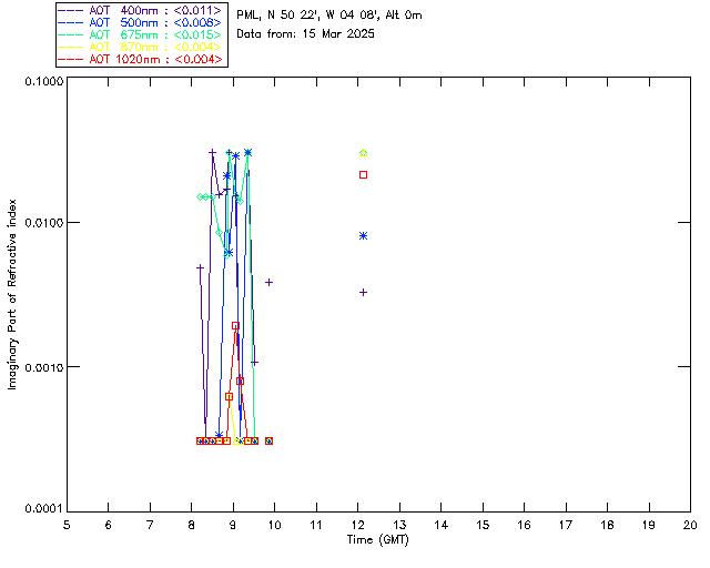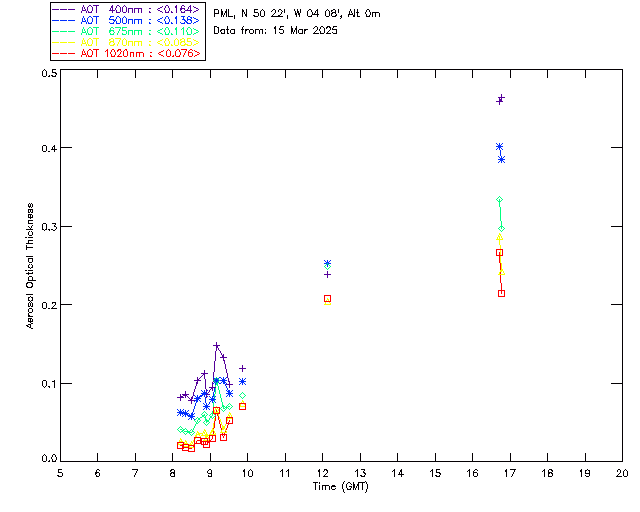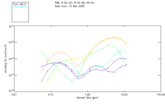 In May 2001 a PREDE POM01-L was installed on the roof of the Plymouth Marine Laboratory to continue the atmospheric correction research of the PML Remote Sensing Group. This was to replace the AERONET CIMEL sunphotometer situated at Rame Head which was decommissioned in 1999. The instrument operates at 7 wavelengths (315, 400, 500, 670, 870, 940 and 1020nm) and scans at pre-set angles away from the solar disk to determine, using the inversion code of Nakajima et al. (2006), various properties of tiny particles called aerosols within the atmospheric column. From these measurements useful atmospheric aerosol parameters such as the Aerosol Optical Thickness (AOT), aerosol size distribution and single scattering albedo can be calculated. Marine aerosols tend to be bigger (D > 1µm) than those generated over the land (0.01 < D < 1µm) and are of a different chemical composition; marine aerosols are salt particles whereas terrestrial aerosols are sulphate compounds.