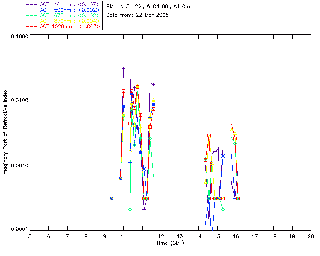 In May 2001 a PREDE POM01-L was installed on the roof of the Plymouth Marine Laboratory to continue the atmospheric correction research of the PML Remote Sensing Group. This was to replace the AERONET CIMEL sunphotometer situated at Rame Head which was decommissioned in 1999. The instrument operates at 7 wavelengths (315, 400, 500, 670, 870, 940 and 1020nm) and scans at pre-set angles away from the solar disk to determine, using the inversion code of Nakajima et al. (2006), various properties of tiny particles called aerosols within the atmospheric column. From these measurements useful atmospheric aerosol parameters such as the Aerosol Optical Thickness (AOT), aerosol size distribution and single scattering albedo can be calculated. Marine aerosols tend to be bigger (D > 1µm) than those generated over the land (0.01 < D < 1µm) and are of a different chemical composition; marine aerosols are salt particles whereas terrestrial aerosols are sulphate compounds.