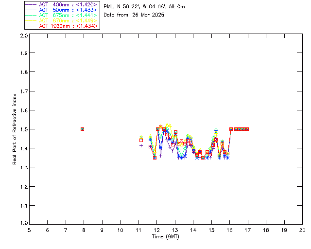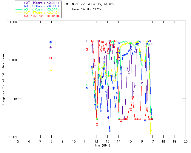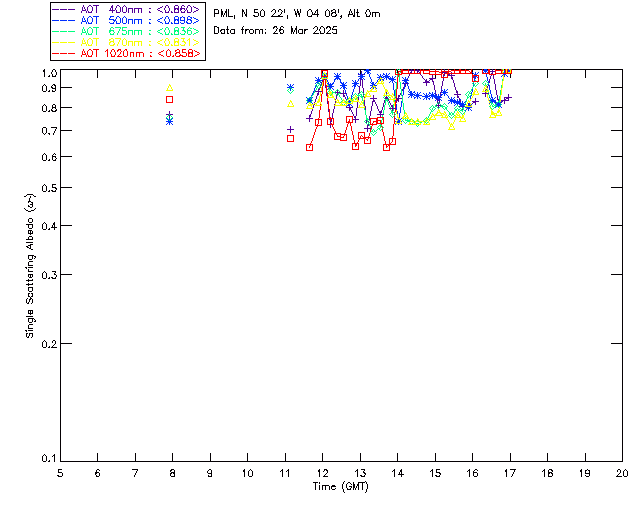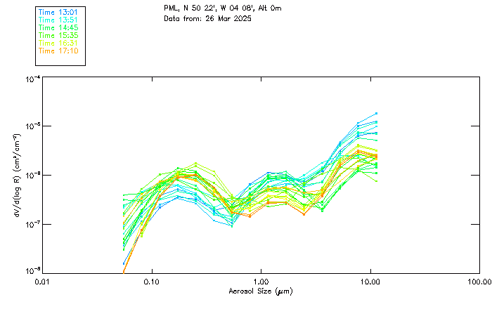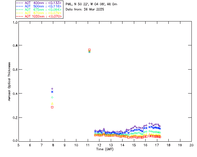 In May 2001 a PREDE POM01-L was installed on the roof of the Plymouth Marine Laboratory to continue the atmospheric correction research of the PML Remote Sensing Group. This was to replace the AERONET CIMEL sunphotometer situated at Rame Head which was decommissioned in 1999. The instrument operates at 7 wavelengths (315, 400, 500, 670, 870, 940 and 1020nm) and scans at pre-set angles away from the solar disk to determine, using the inversion code of Nakajima et al. (2006), various properties of tiny particles called aerosols within the atmospheric column. From these measurements useful atmospheric aerosol parameters such as the Aerosol Optical Thickness (AOT), aerosol size distribution and single scattering albedo can be calculated. Marine aerosols tend to be bigger (D > 1µm) than those generated over the land (0.01 < D < 1µm) and are of a different chemical composition; marine aerosols are salt particles whereas terrestrial aerosols are sulphate compounds.