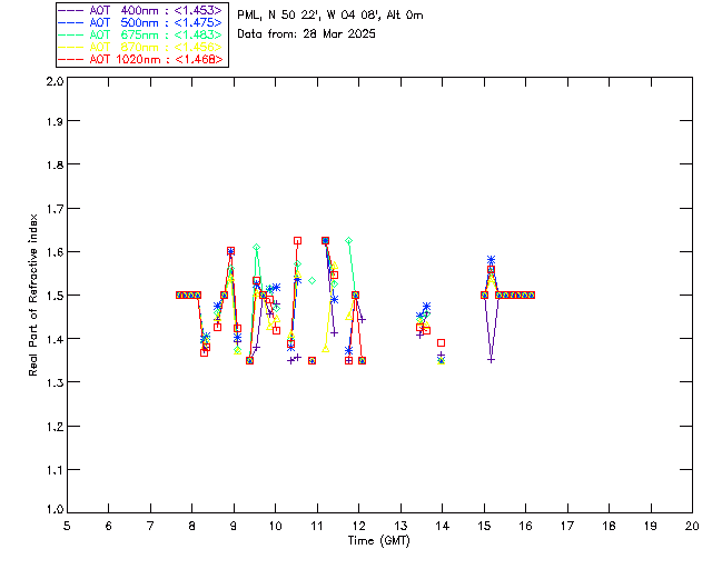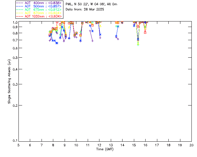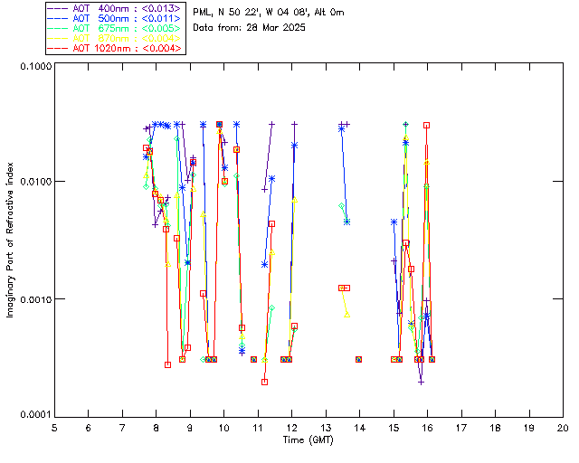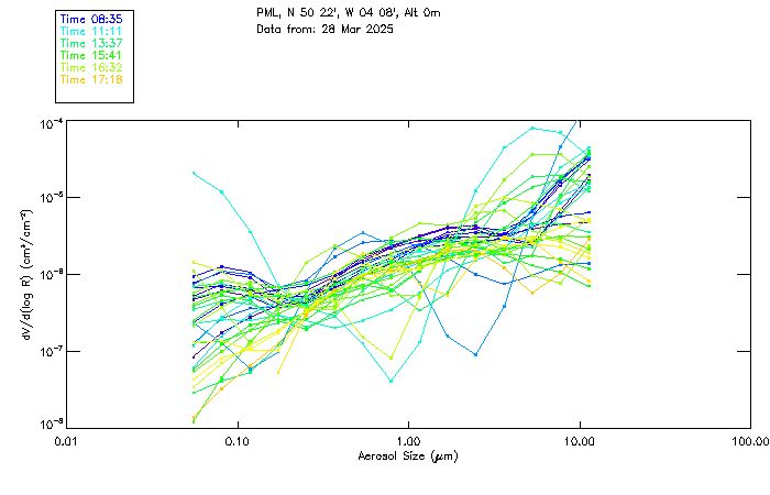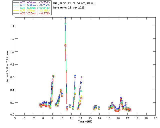 In May 2001 a PREDE POM01-L was installed on the roof of the Plymouth Marine Laboratory to continue the atmospheric correction research of the PML Remote Sensing Group. This was to replace the AERONET CIMEL sunphotometer situated at Rame Head which was decommissioned in 1999. The instrument operates at 7 wavelengths (315, 400, 500, 670, 870, 940 and 1020nm) and scans at pre-set angles away from the solar disk to determine, using the inversion code of Nakajima et al. (2006), various properties of tiny particles called aerosols within the atmospheric column. From these measurements useful atmospheric aerosol parameters such as the Aerosol Optical Thickness (AOT), aerosol size distribution and single scattering albedo can be calculated. Marine aerosols tend to be bigger (D > 1µm) than those generated over the land (0.01 < D < 1µm) and are of a different chemical composition; marine aerosols are salt particles whereas terrestrial aerosols are sulphate compounds.