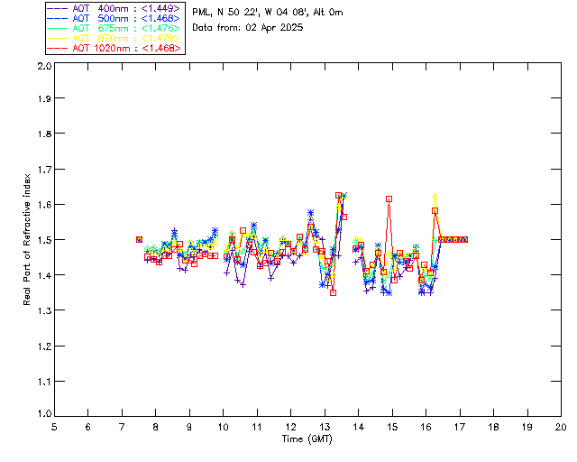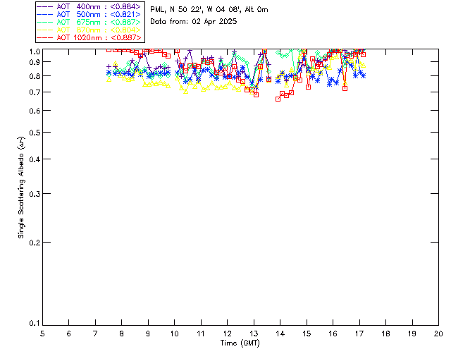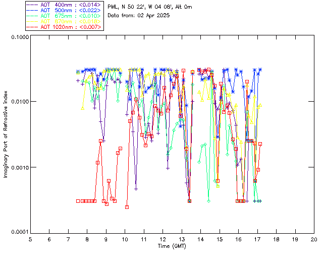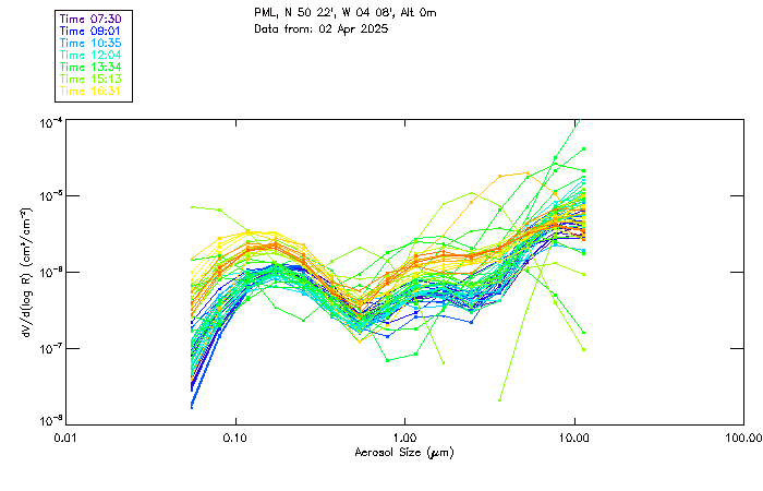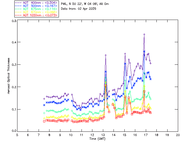 In May 2001 a PREDE POM01-L was installed on the roof of the Plymouth Marine Laboratory to continue the atmospheric correction research of the PML Remote Sensing Group. This was to replace the AERONET CIMEL sunphotometer situated at Rame Head which was decommissioned in 1999. The instrument operates at 7 wavelengths (315, 400, 500, 670, 870, 940 and 1020nm) and scans at pre-set angles away from the solar disk to determine, using the inversion code of Nakajima et al. (2006), various properties of tiny particles called aerosols within the atmospheric column. From these measurements useful atmospheric aerosol parameters such as the Aerosol Optical Thickness (AOT), aerosol size distribution and single scattering albedo can be calculated. Marine aerosols tend to be bigger (D > 1µm) than those generated over the land (0.01 < D < 1µm) and are of a different chemical composition; marine aerosols are salt particles whereas terrestrial aerosols are sulphate compounds.