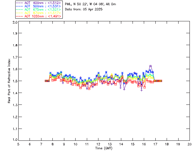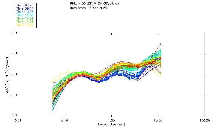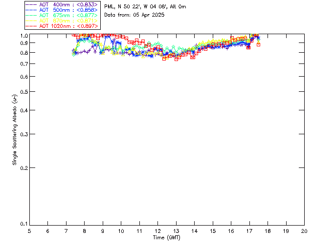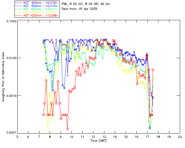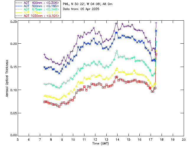 In May 2001 a PREDE POM01-L was installed on the roof of the Plymouth Marine Laboratory to continue the atmospheric correction research of the PML Remote Sensing Group. This was to replace the AERONET CIMEL sunphotometer situated at Rame Head which was decommissioned in 1999. The instrument operates at 7 wavelengths (315, 400, 500, 670, 870, 940 and 1020nm) and scans at pre-set angles away from the solar disk to determine, using the inversion code of Nakajima et al. (2006), various properties of tiny particles called aerosols within the atmospheric column. From these measurements useful atmospheric aerosol parameters such as the Aerosol Optical Thickness (AOT), aerosol size distribution and single scattering albedo can be calculated. Marine aerosols tend to be bigger (D > 1µm) than those generated over the land (0.01 < D < 1µm) and are of a different chemical composition; marine aerosols are salt particles whereas terrestrial aerosols are sulphate compounds.