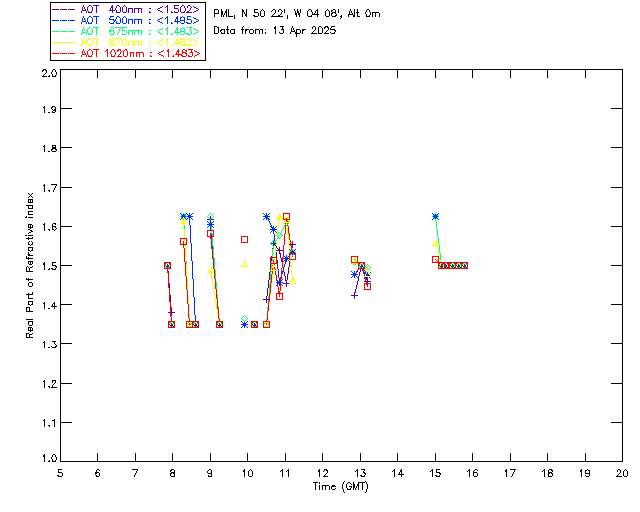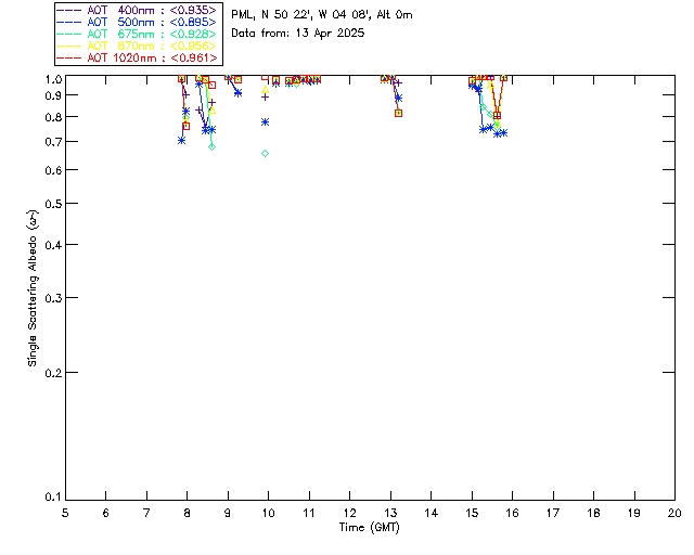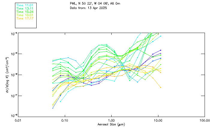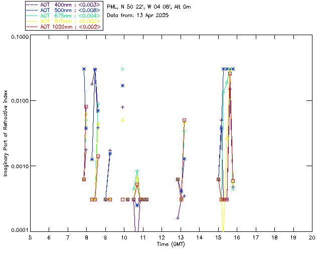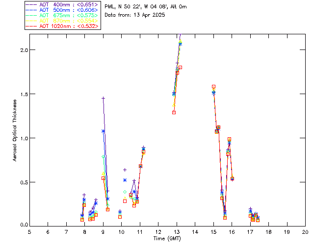 In May 2001 a PREDE POM01-L was installed on the roof of the Plymouth Marine Laboratory to continue the atmospheric correction research of the PML Remote Sensing Group. This was to replace the AERONET CIMEL sunphotometer situated at Rame Head which was decommissioned in 1999. The instrument operates at 7 wavelengths (315, 400, 500, 670, 870, 940 and 1020nm) and scans at pre-set angles away from the solar disk to determine, using the inversion code of Nakajima et al. (2006), various properties of tiny particles called aerosols within the atmospheric column. From these measurements useful atmospheric aerosol parameters such as the Aerosol Optical Thickness (AOT), aerosol size distribution and single scattering albedo can be calculated. Marine aerosols tend to be bigger (D > 1µm) than those generated over the land (0.01 < D < 1µm) and are of a different chemical composition; marine aerosols are salt particles whereas terrestrial aerosols are sulphate compounds.