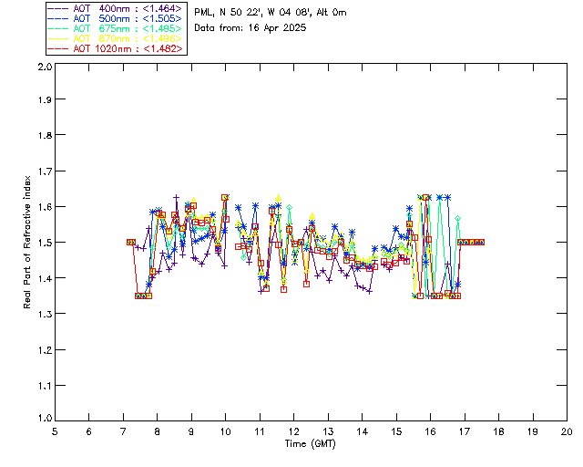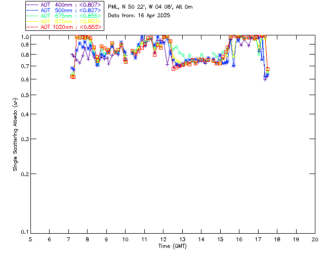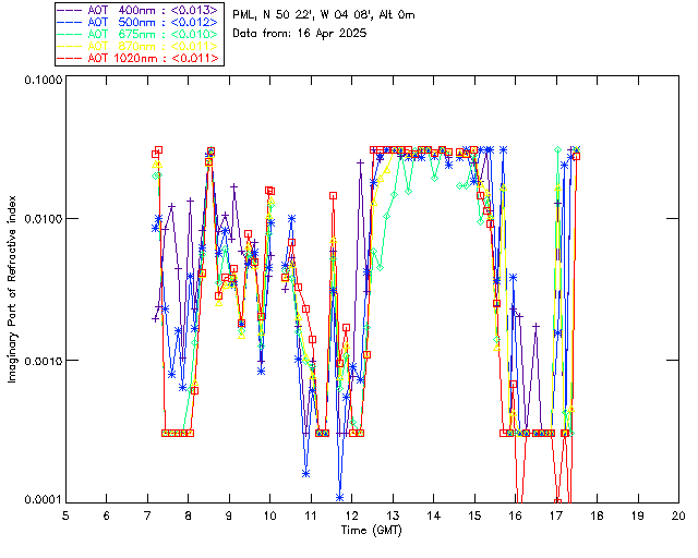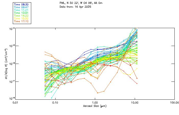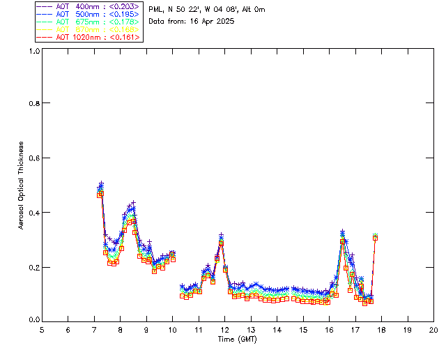 In May 2001 a PREDE POM01-L was installed on the roof of the Plymouth Marine Laboratory to continue the atmospheric correction research of the PML Remote Sensing Group. This was to replace the AERONET CIMEL sunphotometer situated at Rame Head which was decommissioned in 1999. The instrument operates at 7 wavelengths (315, 400, 500, 670, 870, 940 and 1020nm) and scans at pre-set angles away from the solar disk to determine, using the inversion code of Nakajima et al. (2006), various properties of tiny particles called aerosols within the atmospheric column. From these measurements useful atmospheric aerosol parameters such as the Aerosol Optical Thickness (AOT), aerosol size distribution and single scattering albedo can be calculated. Marine aerosols tend to be bigger (D > 1µm) than those generated over the land (0.01 < D < 1µm) and are of a different chemical composition; marine aerosols are salt particles whereas terrestrial aerosols are sulphate compounds.