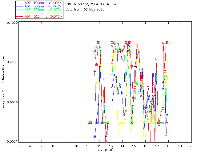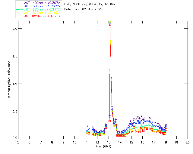 In May 2001 a PREDE POM01-L was installed on the roof of the Plymouth Marine Laboratory to continue the atmospheric correction research of the PML Remote Sensing Group. This was to replace the AERONET CIMEL sunphotometer situated at Rame Head which was decommissioned in 1999. The instrument operates at 7 wavelengths (315, 400, 500, 670, 870, 940 and 1020nm) and scans at pre-set angles away from the solar disk to determine, using the inversion code of Nakajima et al. (2006), various properties of tiny particles called aerosols within the atmospheric column. From these measurements useful atmospheric aerosol parameters such as the Aerosol Optical Thickness (AOT), aerosol size distribution and single scattering albedo can be calculated. Marine aerosols tend to be bigger (D > 1µm) than those generated over the land (0.01 < D < 1µm) and are of a different chemical composition; marine aerosols are salt particles whereas terrestrial aerosols are sulphate compounds.