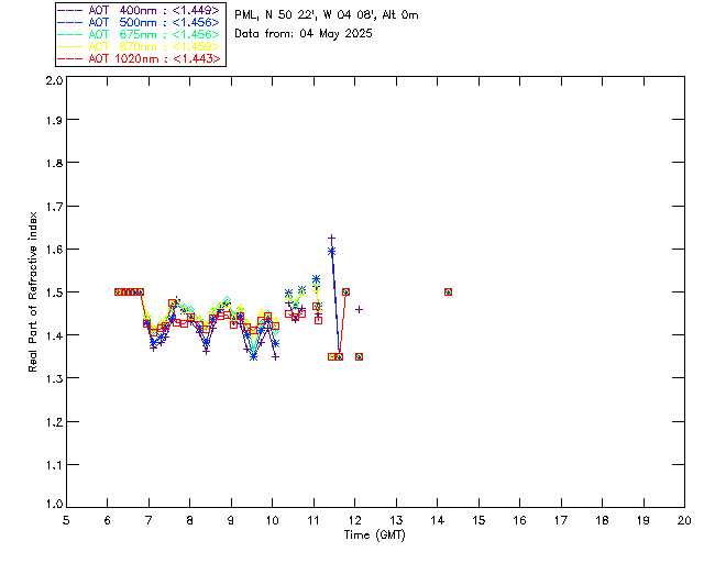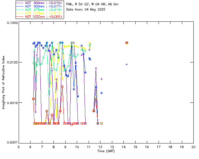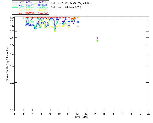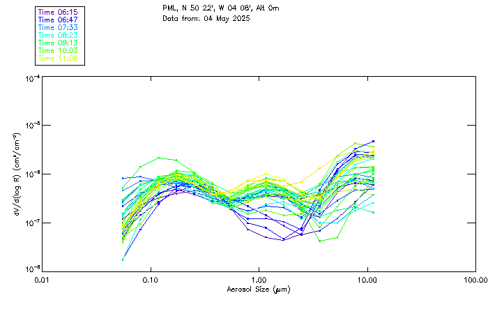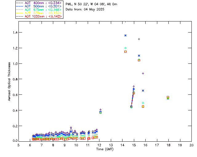 In May 2001 a PREDE POM01-L was installed on the roof of the Plymouth Marine Laboratory to continue the atmospheric correction research of the PML Remote Sensing Group. This was to replace the AERONET CIMEL sunphotometer situated at Rame Head which was decommissioned in 1999. The instrument operates at 7 wavelengths (315, 400, 500, 670, 870, 940 and 1020nm) and scans at pre-set angles away from the solar disk to determine, using the inversion code of Nakajima et al. (2006), various properties of tiny particles called aerosols within the atmospheric column. From these measurements useful atmospheric aerosol parameters such as the Aerosol Optical Thickness (AOT), aerosol size distribution and single scattering albedo can be calculated. Marine aerosols tend to be bigger (D > 1µm) than those generated over the land (0.01 < D < 1µm) and are of a different chemical composition; marine aerosols are salt particles whereas terrestrial aerosols are sulphate compounds.