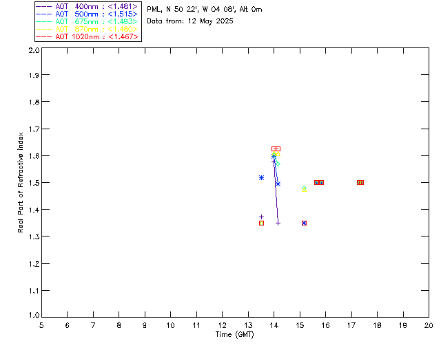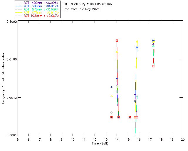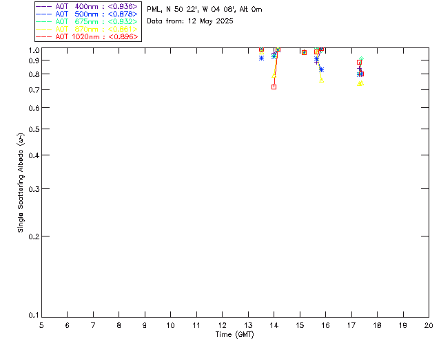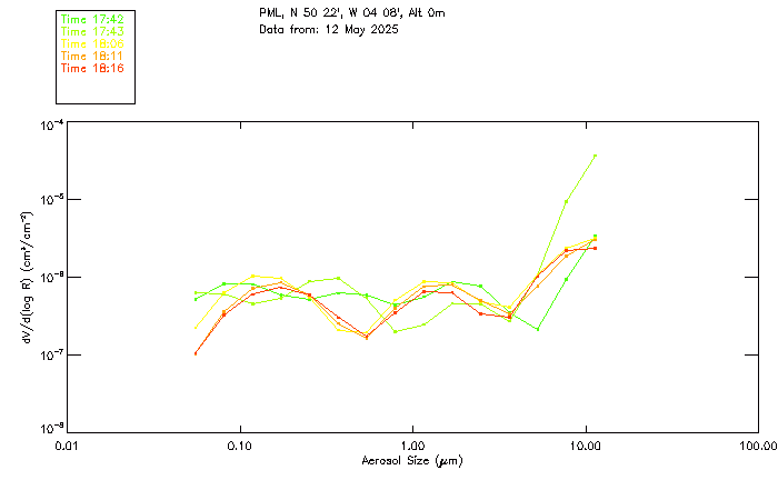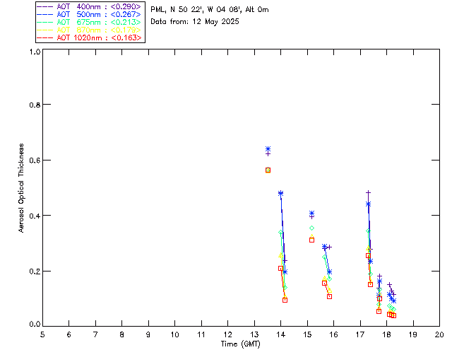 In May 2001 a PREDE POM01-L was installed on the roof of the Plymouth Marine Laboratory to continue the atmospheric correction research of the PML Remote Sensing Group. This was to replace the AERONET CIMEL sunphotometer situated at Rame Head which was decommissioned in 1999. The instrument operates at 7 wavelengths (315, 400, 500, 670, 870, 940 and 1020nm) and scans at pre-set angles away from the solar disk to determine, using the inversion code of Nakajima et al. (2006), various properties of tiny particles called aerosols within the atmospheric column. From these measurements useful atmospheric aerosol parameters such as the Aerosol Optical Thickness (AOT), aerosol size distribution and single scattering albedo can be calculated. Marine aerosols tend to be bigger (D > 1µm) than those generated over the land (0.01 < D < 1µm) and are of a different chemical composition; marine aerosols are salt particles whereas terrestrial aerosols are sulphate compounds.