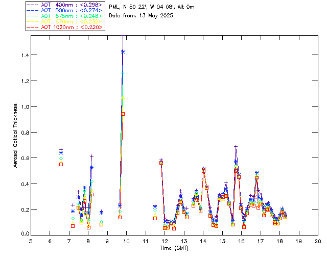 In May 2001 a PREDE POM01-L was installed on the roof of the Plymouth Marine Laboratory to continue the atmospheric correction research of the PML Remote Sensing Group. This was to replace the AERONET CIMEL sunphotometer situated at Rame Head which was decommissioned in 1999. The instrument operates at 7 wavelengths (315, 400, 500, 670, 870, 940 and 1020nm) and scans at pre-set angles away from the solar disk to determine, using the inversion code of Nakajima et al. (2006), various properties of tiny particles called aerosols within the atmospheric column. From these measurements useful atmospheric aerosol parameters such as the Aerosol Optical Thickness (AOT), aerosol size distribution and single scattering albedo can be calculated. Marine aerosols tend to be bigger (D > 1µm) than those generated over the land (0.01 < D < 1µm) and are of a different chemical composition; marine aerosols are salt particles whereas terrestrial aerosols are sulphate compounds.