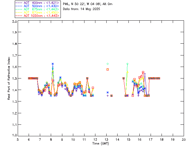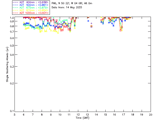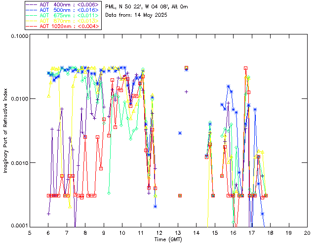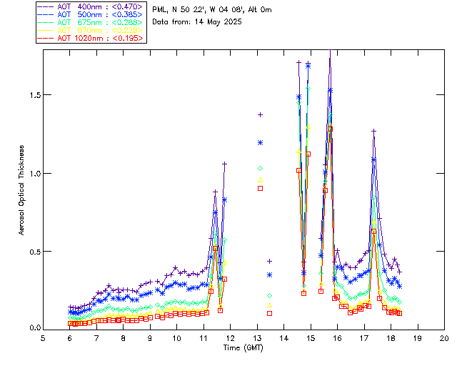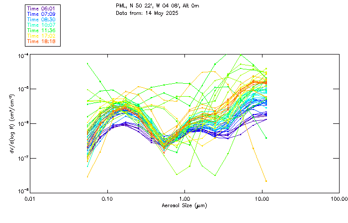 In May 2001 a PREDE POM01-L was installed on the roof of the Plymouth Marine Laboratory to continue the atmospheric correction research of the PML Remote Sensing Group. This was to replace the AERONET CIMEL sunphotometer situated at Rame Head which was decommissioned in 1999. The instrument operates at 7 wavelengths (315, 400, 500, 670, 870, 940 and 1020nm) and scans at pre-set angles away from the solar disk to determine, using the inversion code of Nakajima et al. (2006), various properties of tiny particles called aerosols within the atmospheric column. From these measurements useful atmospheric aerosol parameters such as the Aerosol Optical Thickness (AOT), aerosol size distribution and single scattering albedo can be calculated. Marine aerosols tend to be bigger (D > 1µm) than those generated over the land (0.01 < D < 1µm) and are of a different chemical composition; marine aerosols are salt particles whereas terrestrial aerosols are sulphate compounds.
