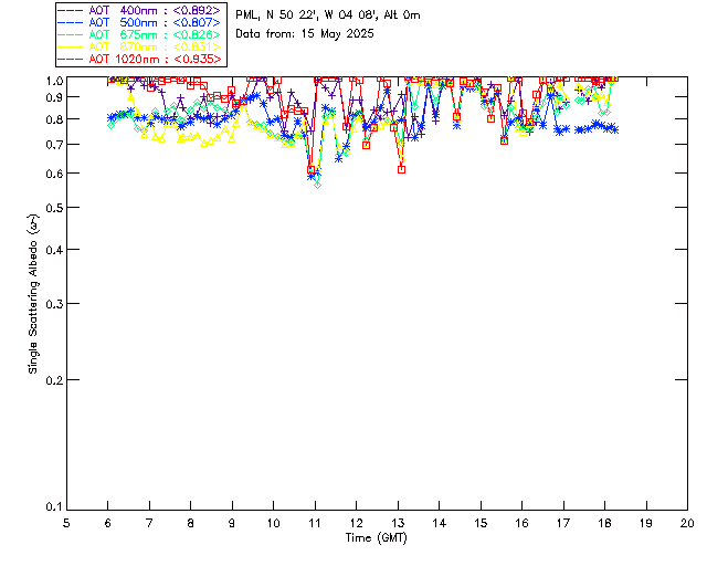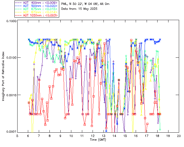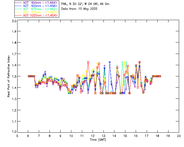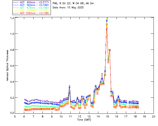 In May 2001 a PREDE POM01-L was installed on the roof of the Plymouth Marine Laboratory to continue the atmospheric correction research of the PML Remote Sensing Group. This was to replace the AERONET CIMEL sunphotometer situated at Rame Head which was decommissioned in 1999. The instrument operates at 7 wavelengths (315, 400, 500, 670, 870, 940 and 1020nm) and scans at pre-set angles away from the solar disk to determine, using the inversion code of Nakajima et al. (2006), various properties of tiny particles called aerosols within the atmospheric column. From these measurements useful atmospheric aerosol parameters such as the Aerosol Optical Thickness (AOT), aerosol size distribution and single scattering albedo can be calculated. Marine aerosols tend to be bigger (D > 1µm) than those generated over the land (0.01 < D < 1µm) and are of a different chemical composition; marine aerosols are salt particles whereas terrestrial aerosols are sulphate compounds.