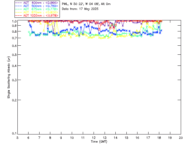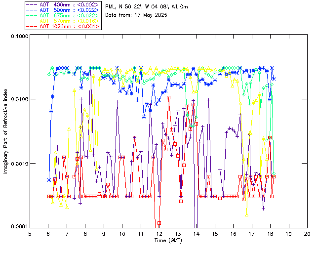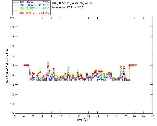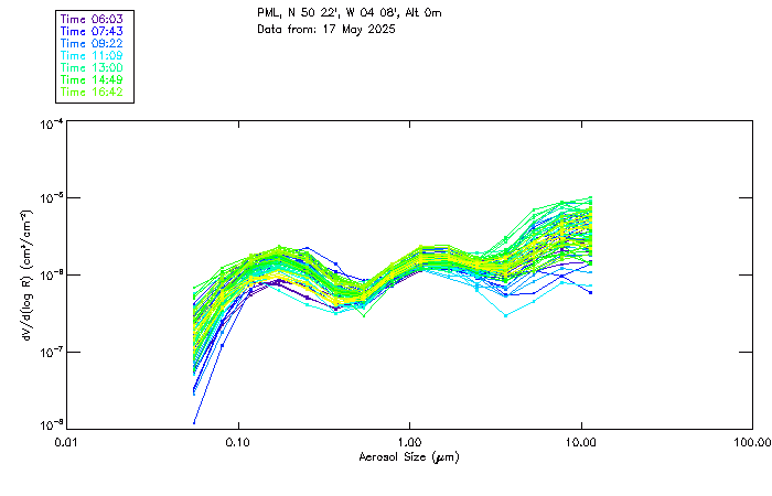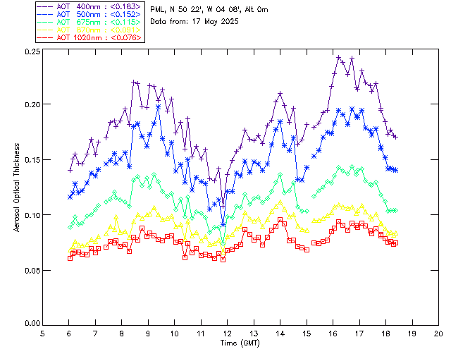 In May 2001 a PREDE POM01-L was installed on the roof of the Plymouth Marine Laboratory to continue the atmospheric correction research of the PML Remote Sensing Group. This was to replace the AERONET CIMEL sunphotometer situated at Rame Head which was decommissioned in 1999. The instrument operates at 7 wavelengths (315, 400, 500, 670, 870, 940 and 1020nm) and scans at pre-set angles away from the solar disk to determine, using the inversion code of Nakajima et al. (2006), various properties of tiny particles called aerosols within the atmospheric column. From these measurements useful atmospheric aerosol parameters such as the Aerosol Optical Thickness (AOT), aerosol size distribution and single scattering albedo can be calculated. Marine aerosols tend to be bigger (D > 1µm) than those generated over the land (0.01 < D < 1µm) and are of a different chemical composition; marine aerosols are salt particles whereas terrestrial aerosols are sulphate compounds.