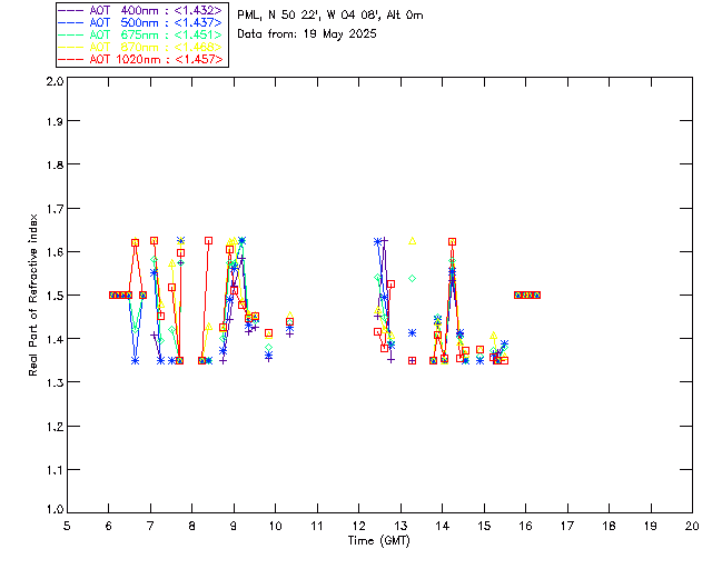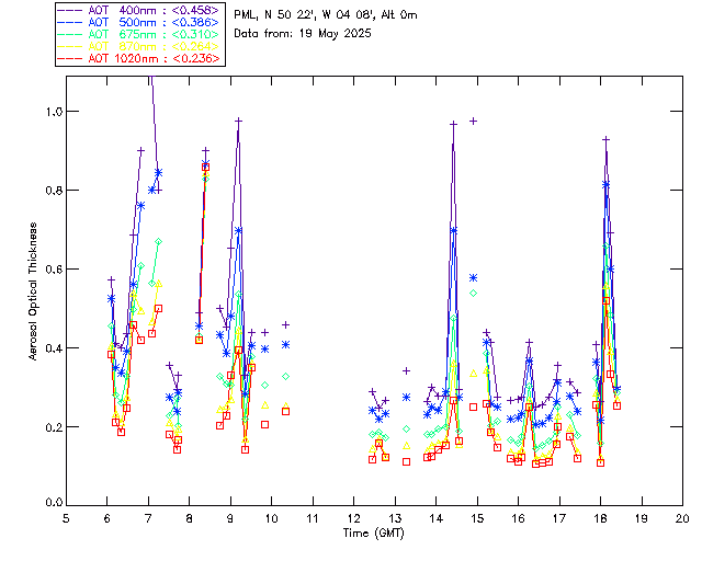 In May 2001 a PREDE POM01-L was installed on the roof of the Plymouth Marine Laboratory to continue the atmospheric correction research of the PML Remote Sensing Group. This was to replace the AERONET CIMEL sunphotometer situated at Rame Head which was decommissioned in 1999. The instrument operates at 7 wavelengths (315, 400, 500, 670, 870, 940 and 1020nm) and scans at pre-set angles away from the solar disk to determine, using the inversion code of Nakajima et al. (2006), various properties of tiny particles called aerosols within the atmospheric column. From these measurements useful atmospheric aerosol parameters such as the Aerosol Optical Thickness (AOT), aerosol size distribution and single scattering albedo can be calculated. Marine aerosols tend to be bigger (D > 1µm) than those generated over the land (0.01 < D < 1µm) and are of a different chemical composition; marine aerosols are salt particles whereas terrestrial aerosols are sulphate compounds.