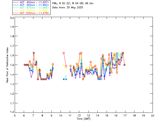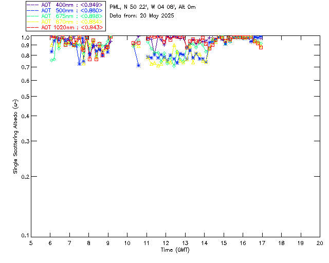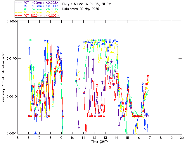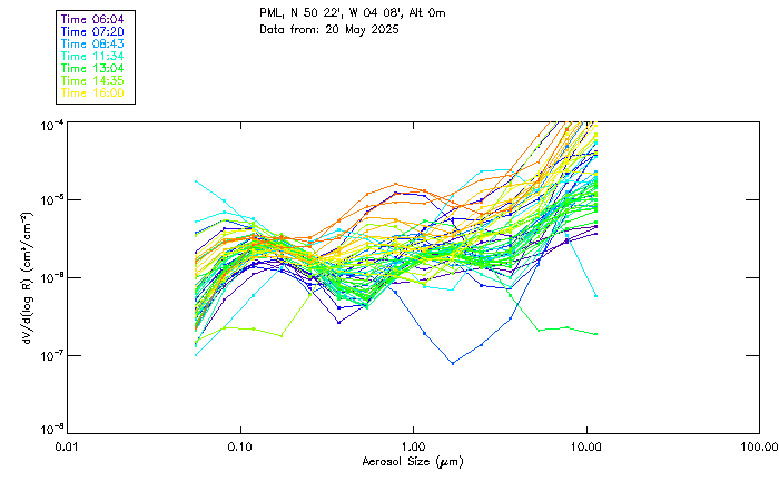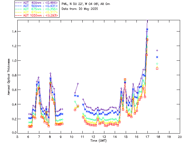 In May 2001 a PREDE POM01-L was installed on the roof of the Plymouth Marine Laboratory to continue the atmospheric correction research of the PML Remote Sensing Group. This was to replace the AERONET CIMEL sunphotometer situated at Rame Head which was decommissioned in 1999. The instrument operates at 7 wavelengths (315, 400, 500, 670, 870, 940 and 1020nm) and scans at pre-set angles away from the solar disk to determine, using the inversion code of Nakajima et al. (2006), various properties of tiny particles called aerosols within the atmospheric column. From these measurements useful atmospheric aerosol parameters such as the Aerosol Optical Thickness (AOT), aerosol size distribution and single scattering albedo can be calculated. Marine aerosols tend to be bigger (D > 1µm) than those generated over the land (0.01 < D < 1µm) and are of a different chemical composition; marine aerosols are salt particles whereas terrestrial aerosols are sulphate compounds.