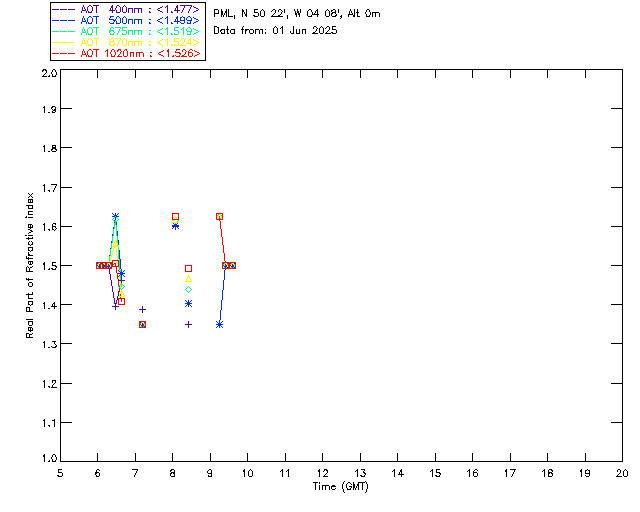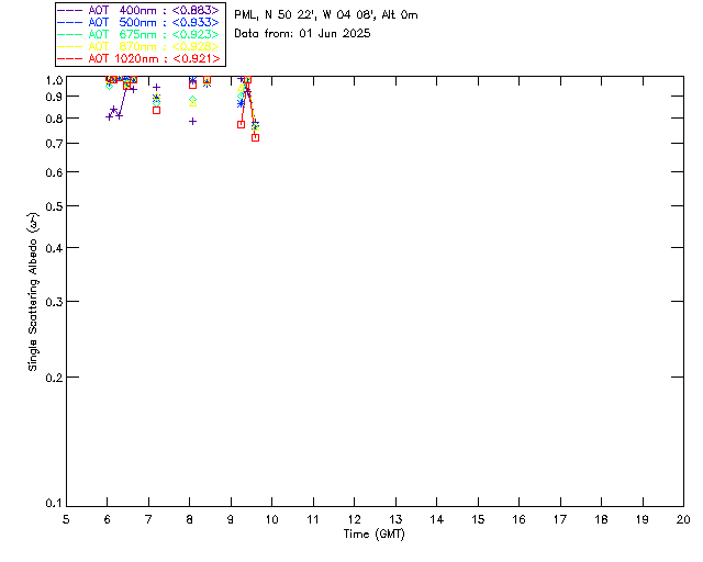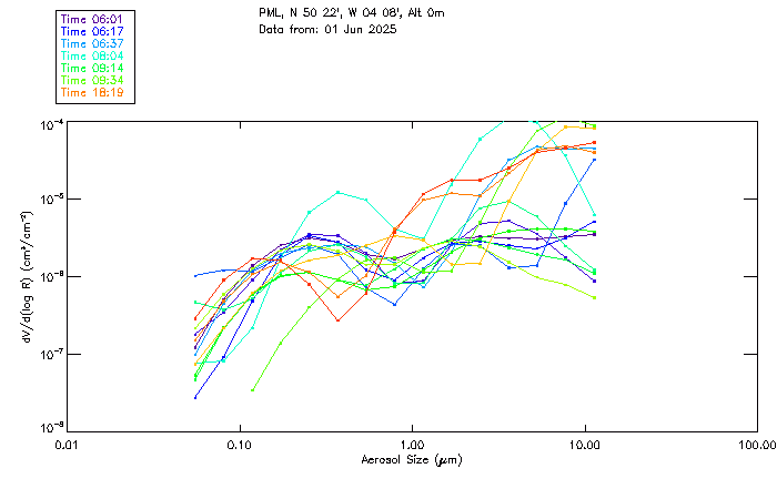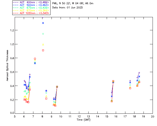 In May 2001 a PREDE POM01-L was installed on the roof of the Plymouth Marine Laboratory to continue the atmospheric correction research of the PML Remote Sensing Group. This was to replace the AERONET CIMEL sunphotometer situated at Rame Head which was decommissioned in 1999. The instrument operates at 7 wavelengths (315, 400, 500, 670, 870, 940 and 1020nm) and scans at pre-set angles away from the solar disk to determine, using the inversion code of Nakajima et al. (2006), various properties of tiny particles called aerosols within the atmospheric column. From these measurements useful atmospheric aerosol parameters such as the Aerosol Optical Thickness (AOT), aerosol size distribution and single scattering albedo can be calculated. Marine aerosols tend to be bigger (D > 1µm) than those generated over the land (0.01 < D < 1µm) and are of a different chemical composition; marine aerosols are salt particles whereas terrestrial aerosols are sulphate compounds.