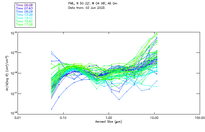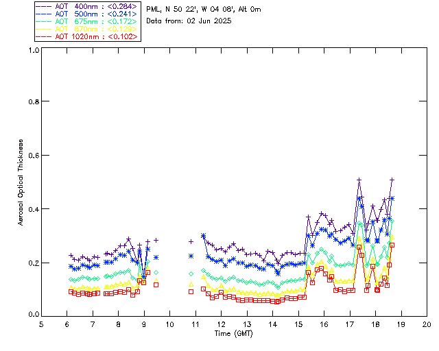 In May 2001 a PREDE POM01-L was installed on the roof of the Plymouth Marine Laboratory to continue the atmospheric correction research of the PML Remote Sensing Group. This was to replace the AERONET CIMEL sunphotometer situated at Rame Head which was decommissioned in 1999. The instrument operates at 7 wavelengths (315, 400, 500, 670, 870, 940 and 1020nm) and scans at pre-set angles away from the solar disk to determine, using the inversion code of Nakajima et al. (2006), various properties of tiny particles called aerosols within the atmospheric column. From these measurements useful atmospheric aerosol parameters such as the Aerosol Optical Thickness (AOT), aerosol size distribution and single scattering albedo can be calculated. Marine aerosols tend to be bigger (D > 1µm) than those generated over the land (0.01 < D < 1µm) and are of a different chemical composition; marine aerosols are salt particles whereas terrestrial aerosols are sulphate compounds.