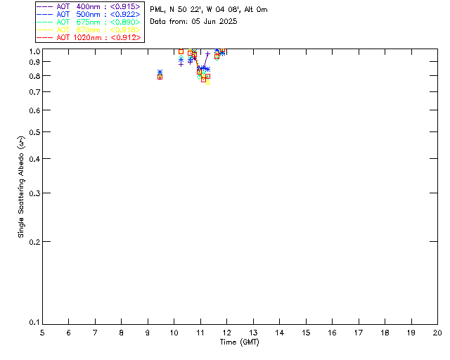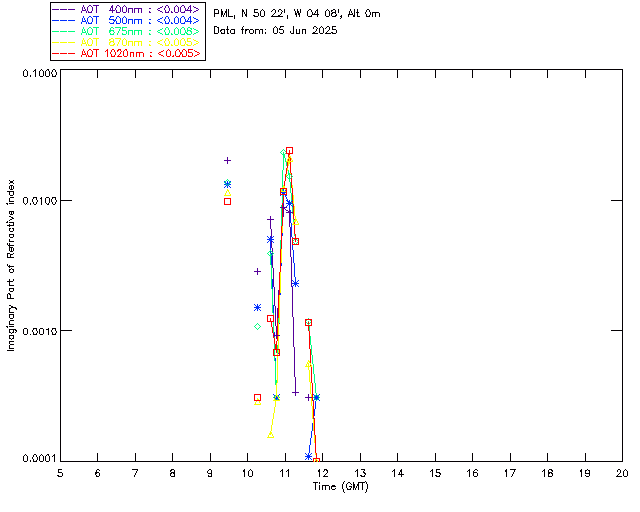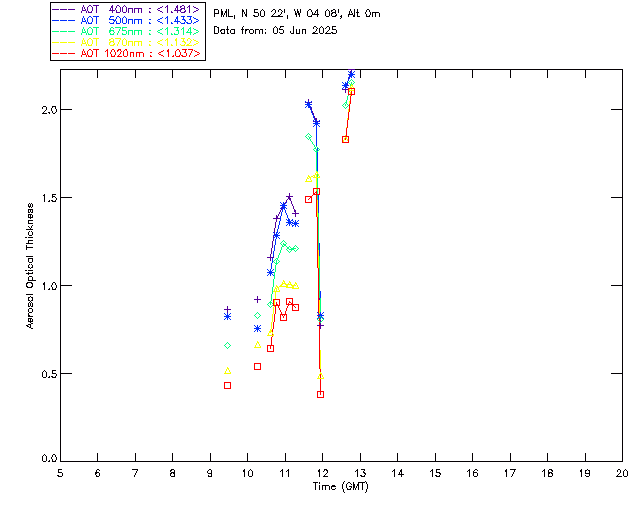 In May 2001 a PREDE POM01-L was installed on the roof of the Plymouth Marine Laboratory to continue the atmospheric correction research of the PML Remote Sensing Group. This was to replace the AERONET CIMEL sunphotometer situated at Rame Head which was decommissioned in 1999. The instrument operates at 7 wavelengths (315, 400, 500, 670, 870, 940 and 1020nm) and scans at pre-set angles away from the solar disk to determine, using the inversion code of Nakajima et al. (2006), various properties of tiny particles called aerosols within the atmospheric column. From these measurements useful atmospheric aerosol parameters such as the Aerosol Optical Thickness (AOT), aerosol size distribution and single scattering albedo can be calculated. Marine aerosols tend to be bigger (D > 1µm) than those generated over the land (0.01 < D < 1µm) and are of a different chemical composition; marine aerosols are salt particles whereas terrestrial aerosols are sulphate compounds.