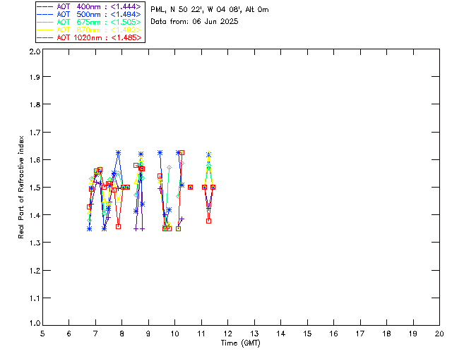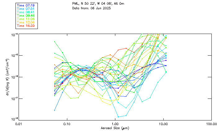 In May 2001 a PREDE POM01-L was installed on the roof of the Plymouth Marine Laboratory to continue the atmospheric correction research of the PML Remote Sensing Group. This was to replace the AERONET CIMEL sunphotometer situated at Rame Head which was decommissioned in 1999. The instrument operates at 7 wavelengths (315, 400, 500, 670, 870, 940 and 1020nm) and scans at pre-set angles away from the solar disk to determine, using the inversion code of Nakajima et al. (2006), various properties of tiny particles called aerosols within the atmospheric column. From these measurements useful atmospheric aerosol parameters such as the Aerosol Optical Thickness (AOT), aerosol size distribution and single scattering albedo can be calculated. Marine aerosols tend to be bigger (D > 1µm) than those generated over the land (0.01 < D < 1µm) and are of a different chemical composition; marine aerosols are salt particles whereas terrestrial aerosols are sulphate compounds.