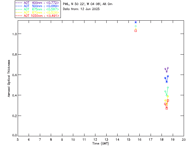 In May 2001 a PREDE POM01-L was installed on the roof of the Plymouth Marine Laboratory to continue the atmospheric correction research of the PML Remote Sensing Group. This was to replace the AERONET CIMEL sunphotometer situated at Rame Head which was decommissioned in 1999. The instrument operates at 7 wavelengths (315, 400, 500, 670, 870, 940 and 1020nm) and scans at pre-set angles away from the solar disk to determine, using the inversion code of Nakajima et al. (2006), various properties of tiny particles called aerosols within the atmospheric column. From these measurements useful atmospheric aerosol parameters such as the Aerosol Optical Thickness (AOT), aerosol size distribution and single scattering albedo can be calculated. Marine aerosols tend to be bigger (D > 1µm) than those generated over the land (0.01 < D < 1µm) and are of a different chemical composition; marine aerosols are salt particles whereas terrestrial aerosols are sulphate compounds.