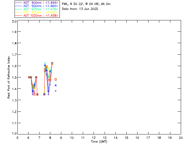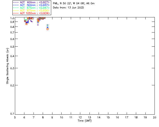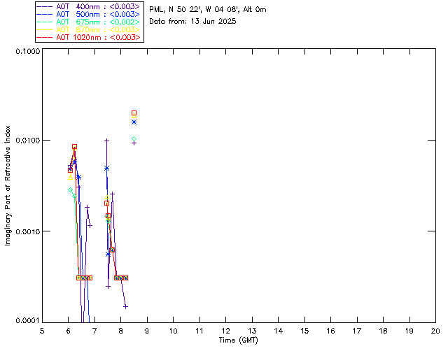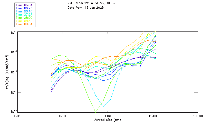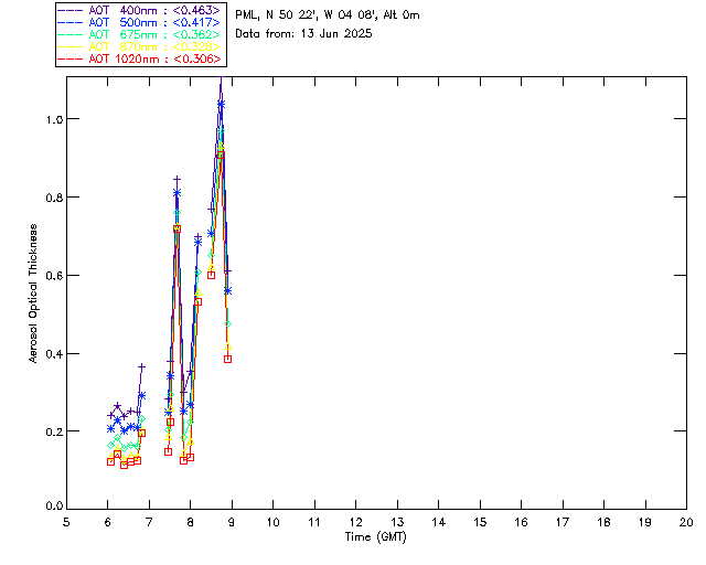 In May 2001 a PREDE POM01-L was installed on the roof of the Plymouth Marine Laboratory to continue the atmospheric correction research of the PML Remote Sensing Group. This was to replace the AERONET CIMEL sunphotometer situated at Rame Head which was decommissioned in 1999. The instrument operates at 7 wavelengths (315, 400, 500, 670, 870, 940 and 1020nm) and scans at pre-set angles away from the solar disk to determine, using the inversion code of Nakajima et al. (2006), various properties of tiny particles called aerosols within the atmospheric column. From these measurements useful atmospheric aerosol parameters such as the Aerosol Optical Thickness (AOT), aerosol size distribution and single scattering albedo can be calculated. Marine aerosols tend to be bigger (D > 1µm) than those generated over the land (0.01 < D < 1µm) and are of a different chemical composition; marine aerosols are salt particles whereas terrestrial aerosols are sulphate compounds.