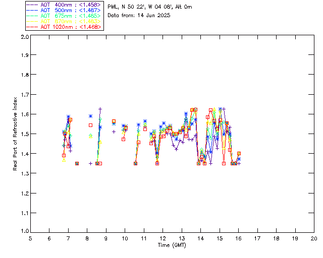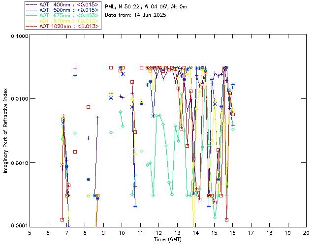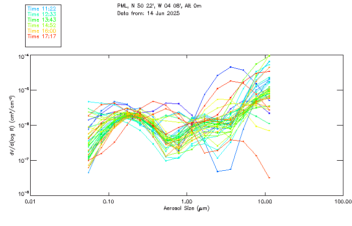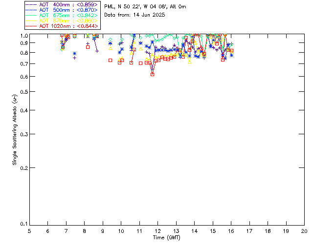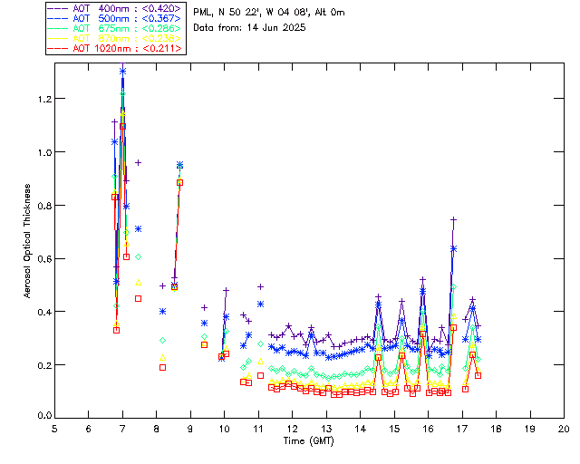 In May 2001 a PREDE POM01-L was installed on the roof of the Plymouth Marine Laboratory to continue the atmospheric correction research of the PML Remote Sensing Group. This was to replace the AERONET CIMEL sunphotometer situated at Rame Head which was decommissioned in 1999. The instrument operates at 7 wavelengths (315, 400, 500, 670, 870, 940 and 1020nm) and scans at pre-set angles away from the solar disk to determine, using the inversion code of Nakajima et al. (2006), various properties of tiny particles called aerosols within the atmospheric column. From these measurements useful atmospheric aerosol parameters such as the Aerosol Optical Thickness (AOT), aerosol size distribution and single scattering albedo can be calculated. Marine aerosols tend to be bigger (D > 1µm) than those generated over the land (0.01 < D < 1µm) and are of a different chemical composition; marine aerosols are salt particles whereas terrestrial aerosols are sulphate compounds.