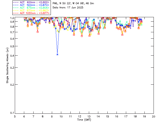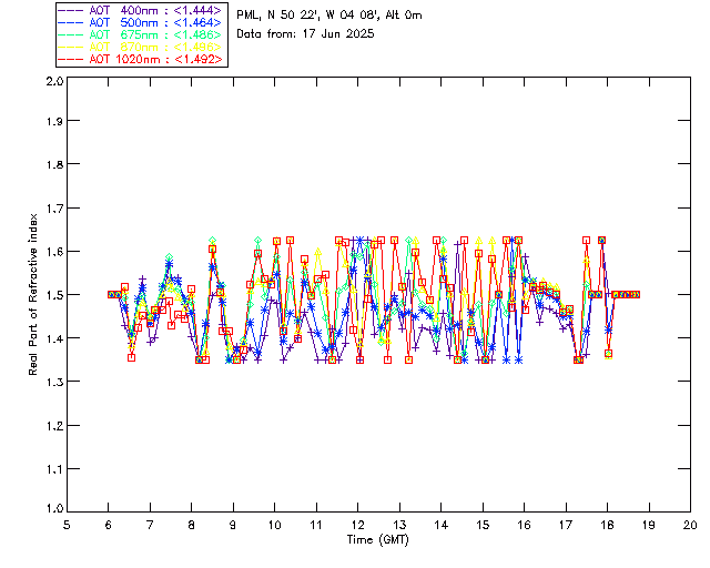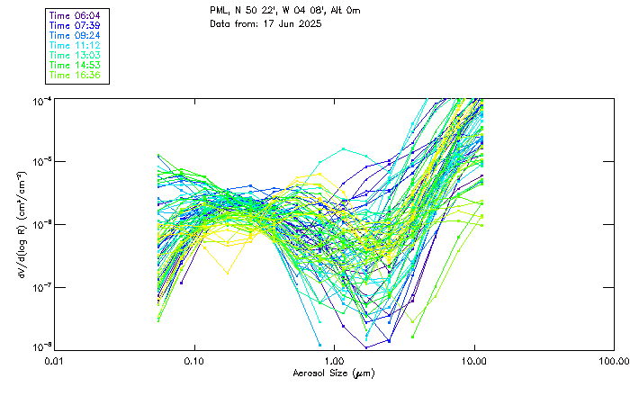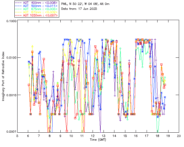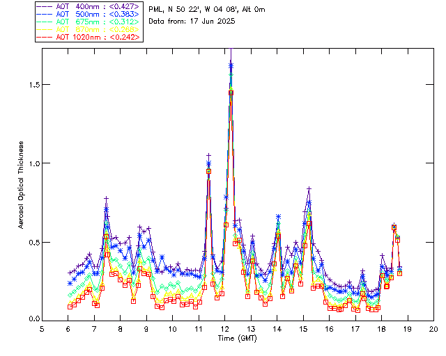 In May 2001 a PREDE POM01-L was installed on the roof of the Plymouth Marine Laboratory to continue the atmospheric correction research of the PML Remote Sensing Group. This was to replace the AERONET CIMEL sunphotometer situated at Rame Head which was decommissioned in 1999. The instrument operates at 7 wavelengths (315, 400, 500, 670, 870, 940 and 1020nm) and scans at pre-set angles away from the solar disk to determine, using the inversion code of Nakajima et al. (2006), various properties of tiny particles called aerosols within the atmospheric column. From these measurements useful atmospheric aerosol parameters such as the Aerosol Optical Thickness (AOT), aerosol size distribution and single scattering albedo can be calculated. Marine aerosols tend to be bigger (D > 1µm) than those generated over the land (0.01 < D < 1µm) and are of a different chemical composition; marine aerosols are salt particles whereas terrestrial aerosols are sulphate compounds.