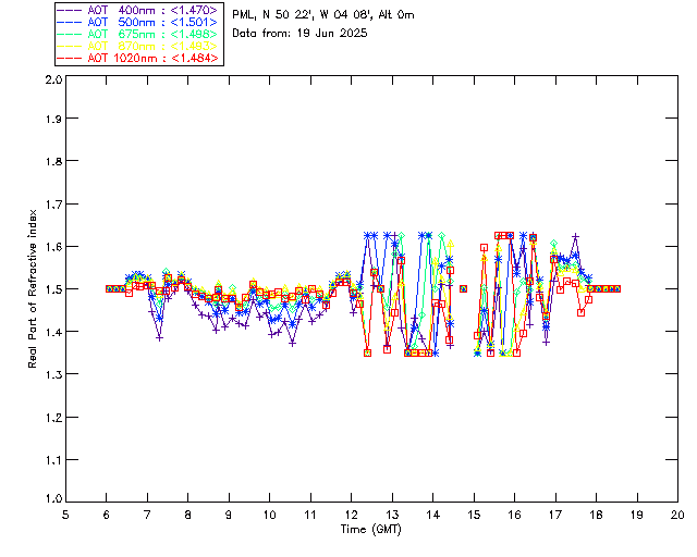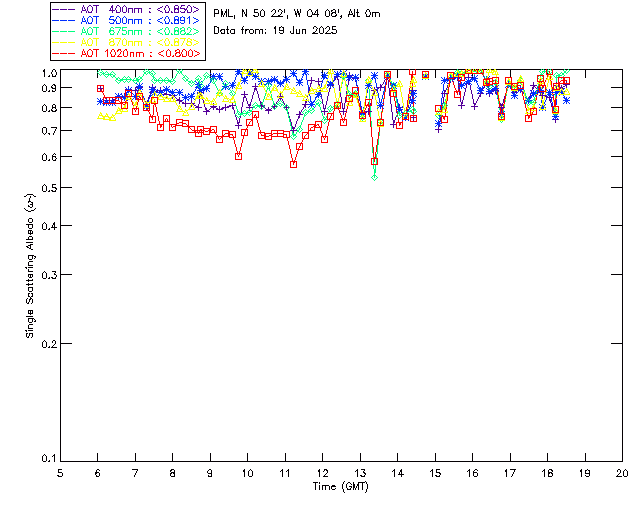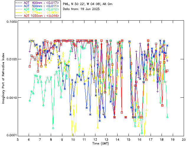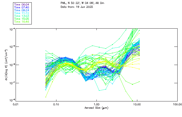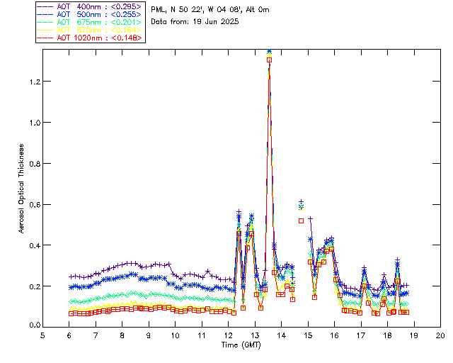 In May 2001 a PREDE POM01-L was installed on the roof of the Plymouth Marine Laboratory to continue the atmospheric correction research of the PML Remote Sensing Group. This was to replace the AERONET CIMEL sunphotometer situated at Rame Head which was decommissioned in 1999. The instrument operates at 7 wavelengths (315, 400, 500, 670, 870, 940 and 1020nm) and scans at pre-set angles away from the solar disk to determine, using the inversion code of Nakajima et al. (2006), various properties of tiny particles called aerosols within the atmospheric column. From these measurements useful atmospheric aerosol parameters such as the Aerosol Optical Thickness (AOT), aerosol size distribution and single scattering albedo can be calculated. Marine aerosols tend to be bigger (D > 1µm) than those generated over the land (0.01 < D < 1µm) and are of a different chemical composition; marine aerosols are salt particles whereas terrestrial aerosols are sulphate compounds.