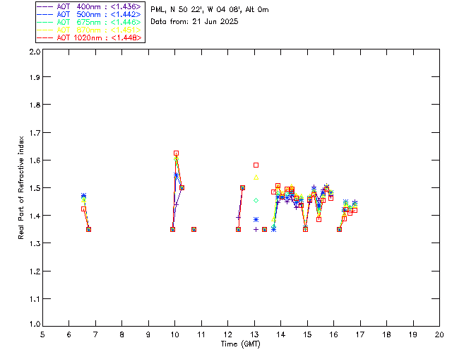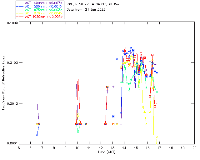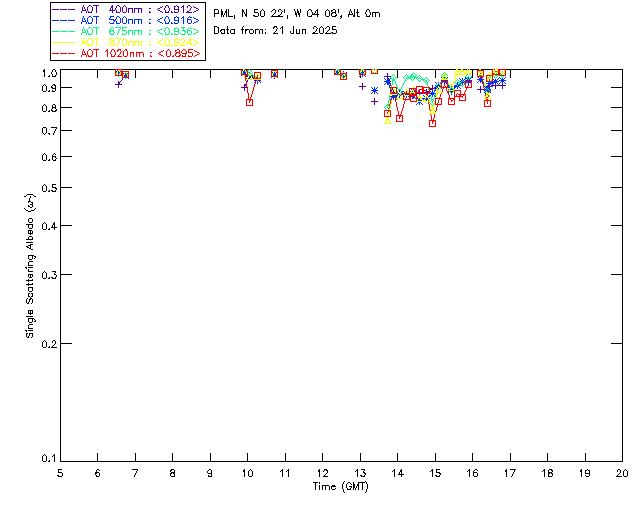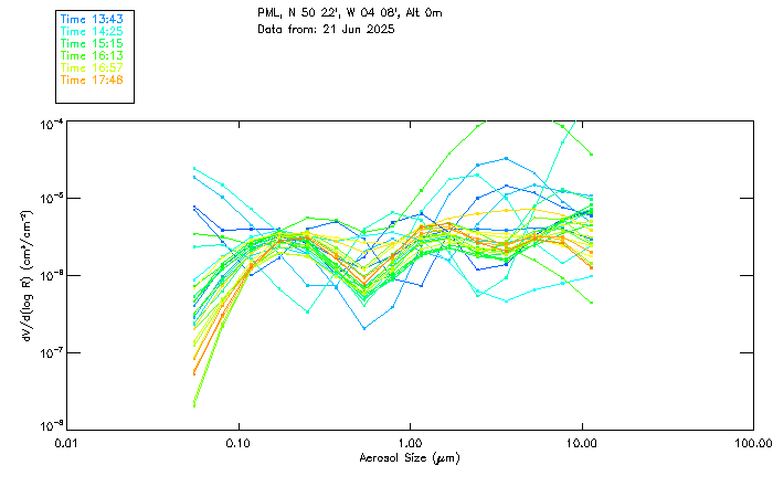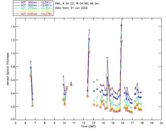In May 2001 a PREDE POM01-L was installed on the roof of the Plymouth Marine Laboratory to continue the atmospheric correction research of the PML Remote Sensing Group. This was to replace the AERONET CIMEL sunphotometer situated at Rame Head which was decommissioned in 1999. The instrument operates at 7 wavelengths (315, 400, 500, 670, 870, 940 and 1020nm) and scans at pre-set angles away from the solar disk to determine, using the inversion code of Nakajima et al. (2006), various properties of tiny particles called aerosols within the atmospheric column. From these measurements useful atmospheric aerosol parameters such as the Aerosol Optical Thickness (AOT), aerosol size distribution and single scattering albedo can be calculated. Marine aerosols tend to be bigger (D > 1µm) than those generated over the land (0.01 < D < 1µm) and are of a different chemical composition; marine aerosols are salt particles whereas terrestrial aerosols are sulphate compounds.