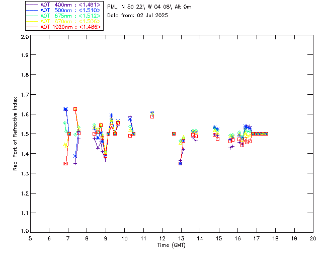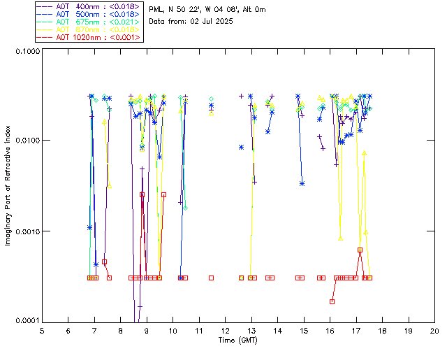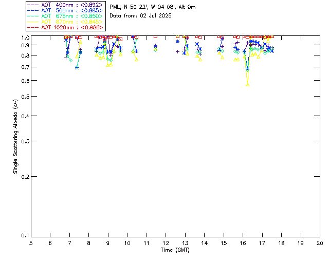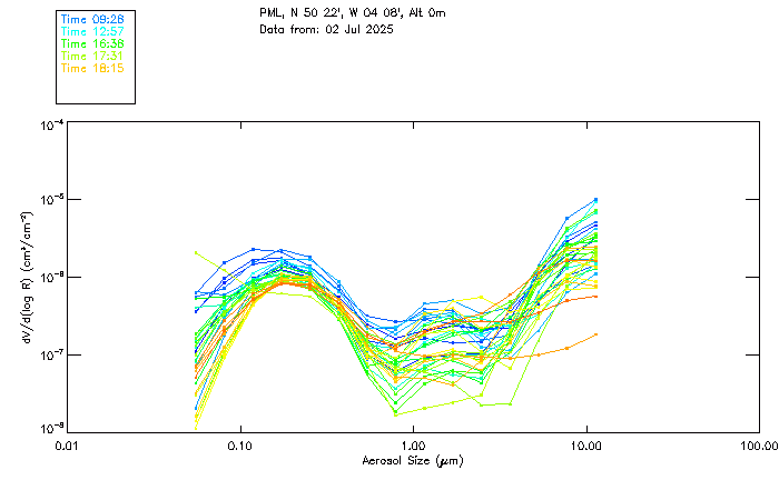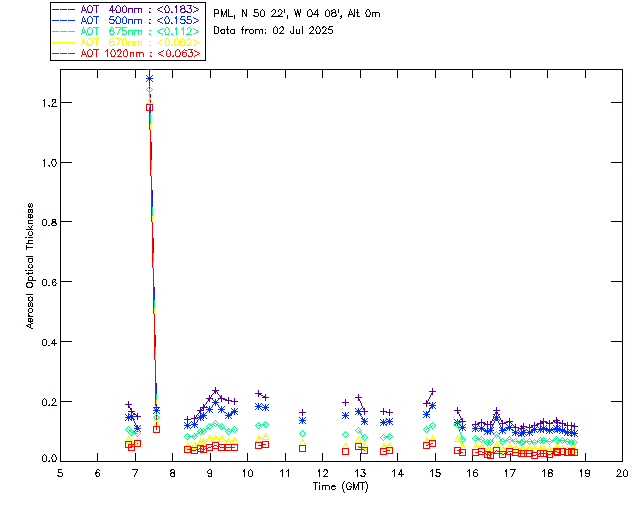 In May 2001 a PREDE POM01-L was installed on the roof of the Plymouth Marine Laboratory to continue the atmospheric correction research of the PML Remote Sensing Group. This was to replace the AERONET CIMEL sunphotometer situated at Rame Head which was decommissioned in 1999. The instrument operates at 7 wavelengths (315, 400, 500, 670, 870, 940 and 1020nm) and scans at pre-set angles away from the solar disk to determine, using the inversion code of Nakajima et al. (2006), various properties of tiny particles called aerosols within the atmospheric column. From these measurements useful atmospheric aerosol parameters such as the Aerosol Optical Thickness (AOT), aerosol size distribution and single scattering albedo can be calculated. Marine aerosols tend to be bigger (D > 1µm) than those generated over the land (0.01 < D < 1µm) and are of a different chemical composition; marine aerosols are salt particles whereas terrestrial aerosols are sulphate compounds.