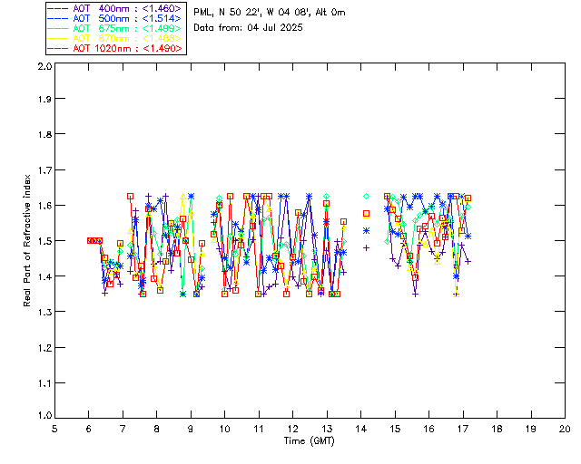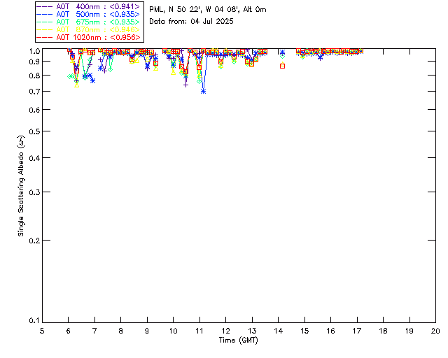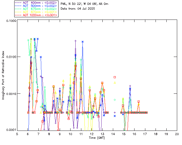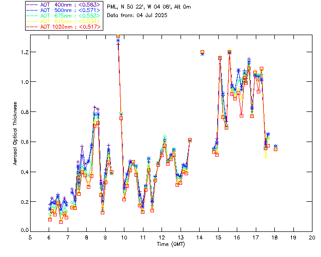 In May 2001 a PREDE POM01-L was installed on the roof of the Plymouth Marine Laboratory to continue the atmospheric correction research of the PML Remote Sensing Group. This was to replace the AERONET CIMEL sunphotometer situated at Rame Head which was decommissioned in 1999. The instrument operates at 7 wavelengths (315, 400, 500, 670, 870, 940 and 1020nm) and scans at pre-set angles away from the solar disk to determine, using the inversion code of Nakajima et al. (2006), various properties of tiny particles called aerosols within the atmospheric column. From these measurements useful atmospheric aerosol parameters such as the Aerosol Optical Thickness (AOT), aerosol size distribution and single scattering albedo can be calculated. Marine aerosols tend to be bigger (D > 1µm) than those generated over the land (0.01 < D < 1µm) and are of a different chemical composition; marine aerosols are salt particles whereas terrestrial aerosols are sulphate compounds.