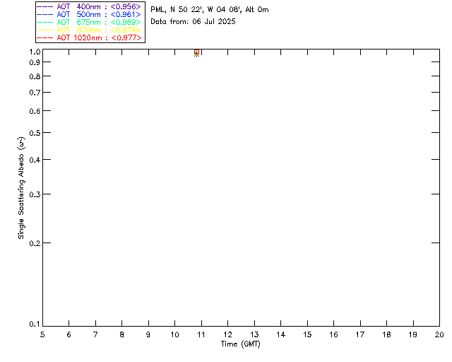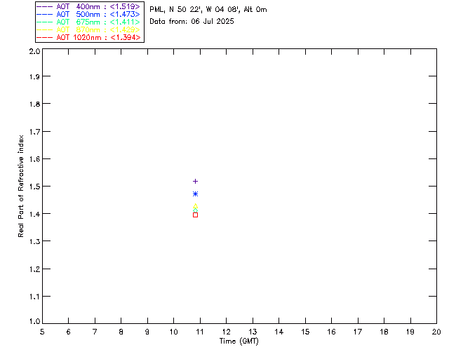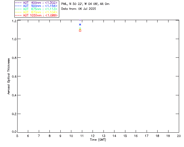 In May 2001 a PREDE POM01-L was installed on the roof of the Plymouth Marine Laboratory to continue the atmospheric correction research of the PML Remote Sensing Group. This was to replace the AERONET CIMEL sunphotometer situated at Rame Head which was decommissioned in 1999. The instrument operates at 7 wavelengths (315, 400, 500, 670, 870, 940 and 1020nm) and scans at pre-set angles away from the solar disk to determine, using the inversion code of Nakajima et al. (2006), various properties of tiny particles called aerosols within the atmospheric column. From these measurements useful atmospheric aerosol parameters such as the Aerosol Optical Thickness (AOT), aerosol size distribution and single scattering albedo can be calculated. Marine aerosols tend to be bigger (D > 1µm) than those generated over the land (0.01 < D < 1µm) and are of a different chemical composition; marine aerosols are salt particles whereas terrestrial aerosols are sulphate compounds.