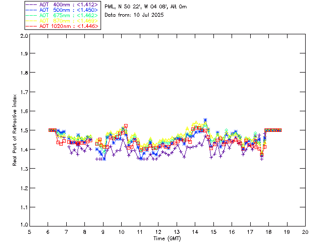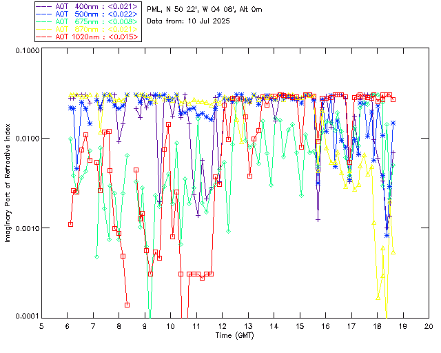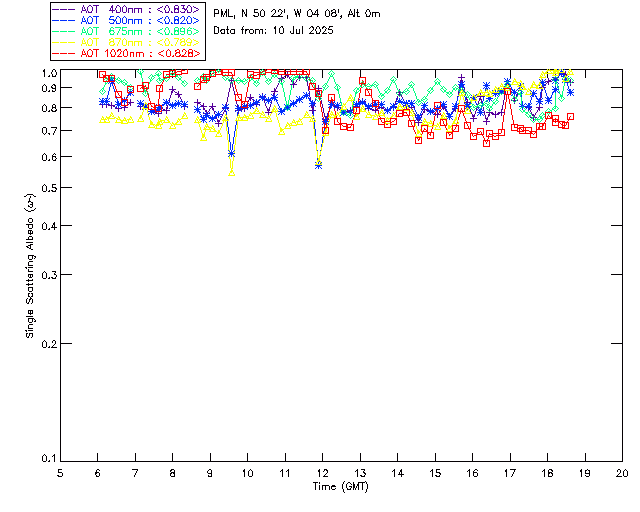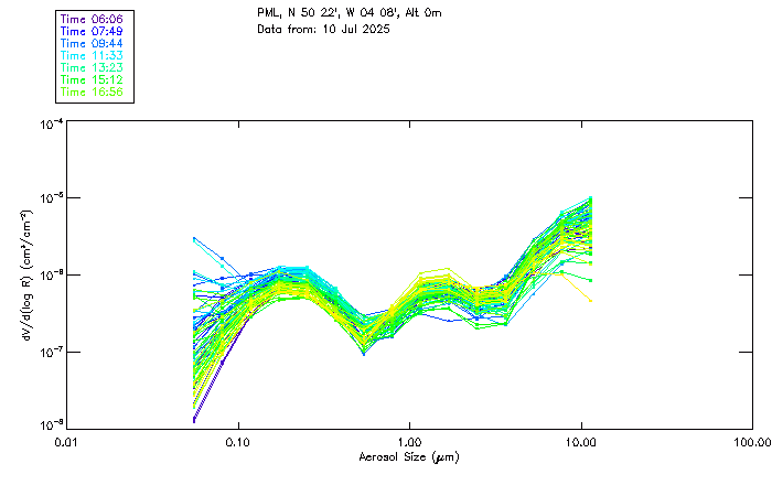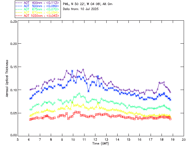 In May 2001 a PREDE POM01-L was installed on the roof of the Plymouth Marine Laboratory to continue the atmospheric correction research of the PML Remote Sensing Group. This was to replace the AERONET CIMEL sunphotometer situated at Rame Head which was decommissioned in 1999. The instrument operates at 7 wavelengths (315, 400, 500, 670, 870, 940 and 1020nm) and scans at pre-set angles away from the solar disk to determine, using the inversion code of Nakajima et al. (2006), various properties of tiny particles called aerosols within the atmospheric column. From these measurements useful atmospheric aerosol parameters such as the Aerosol Optical Thickness (AOT), aerosol size distribution and single scattering albedo can be calculated. Marine aerosols tend to be bigger (D > 1µm) than those generated over the land (0.01 < D < 1µm) and are of a different chemical composition; marine aerosols are salt particles whereas terrestrial aerosols are sulphate compounds.