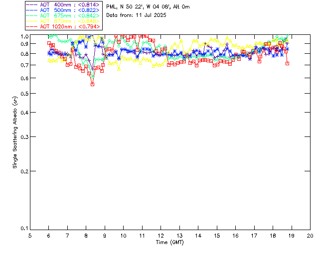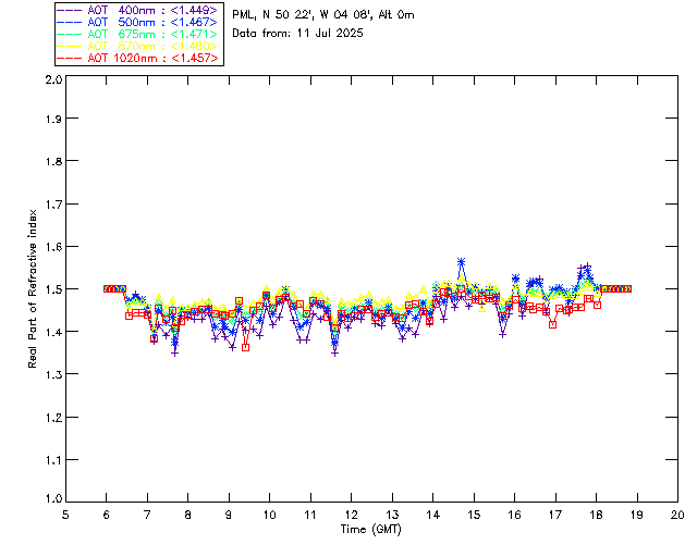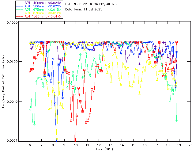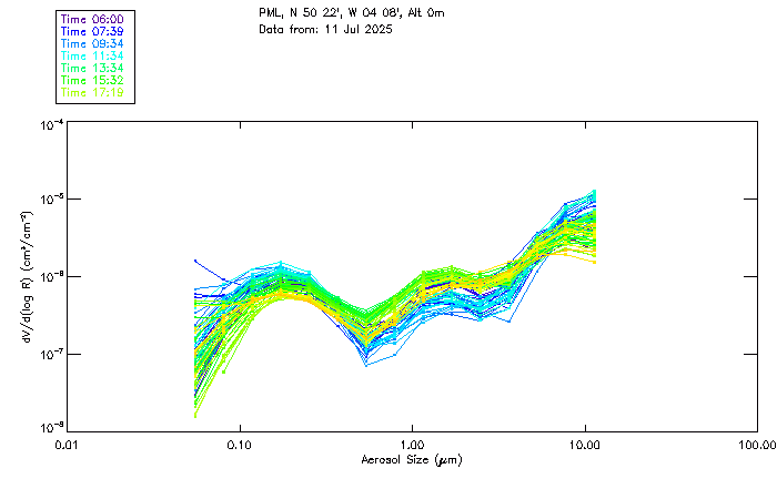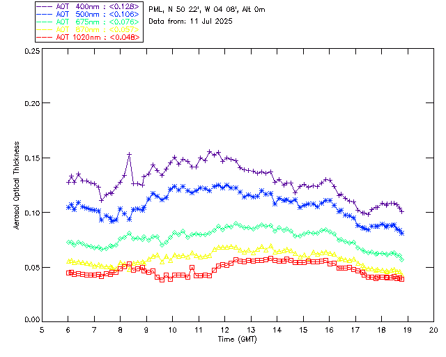 In May 2001 a PREDE POM01-L was installed on the roof of the Plymouth Marine Laboratory to continue the atmospheric correction research of the PML Remote Sensing Group. This was to replace the AERONET CIMEL sunphotometer situated at Rame Head which was decommissioned in 1999. The instrument operates at 7 wavelengths (315, 400, 500, 670, 870, 940 and 1020nm) and scans at pre-set angles away from the solar disk to determine, using the inversion code of Nakajima et al. (2006), various properties of tiny particles called aerosols within the atmospheric column. From these measurements useful atmospheric aerosol parameters such as the Aerosol Optical Thickness (AOT), aerosol size distribution and single scattering albedo can be calculated. Marine aerosols tend to be bigger (D > 1µm) than those generated over the land (0.01 < D < 1µm) and are of a different chemical composition; marine aerosols are salt particles whereas terrestrial aerosols are sulphate compounds.