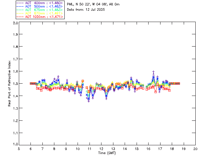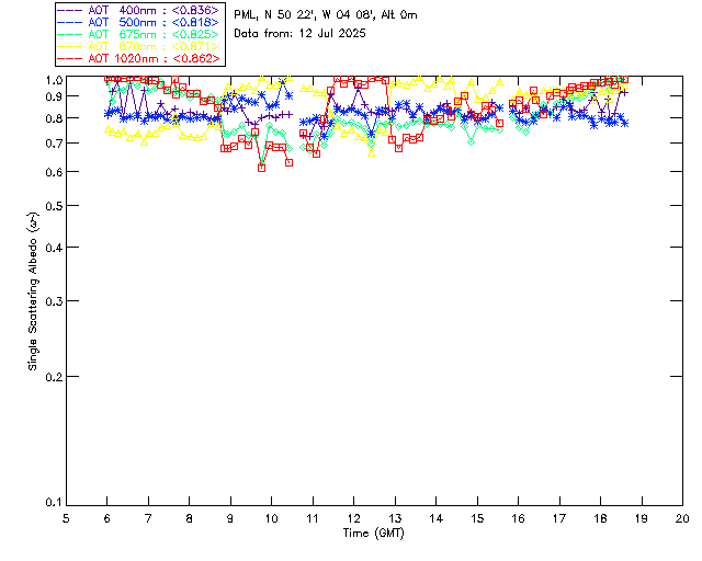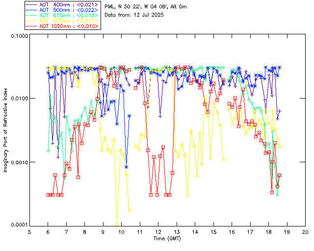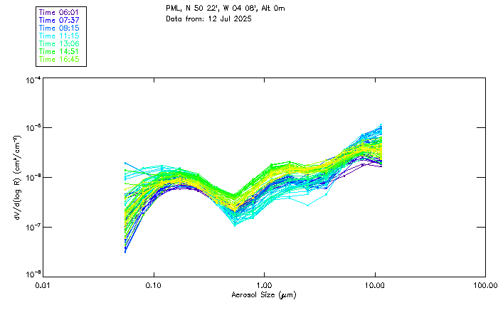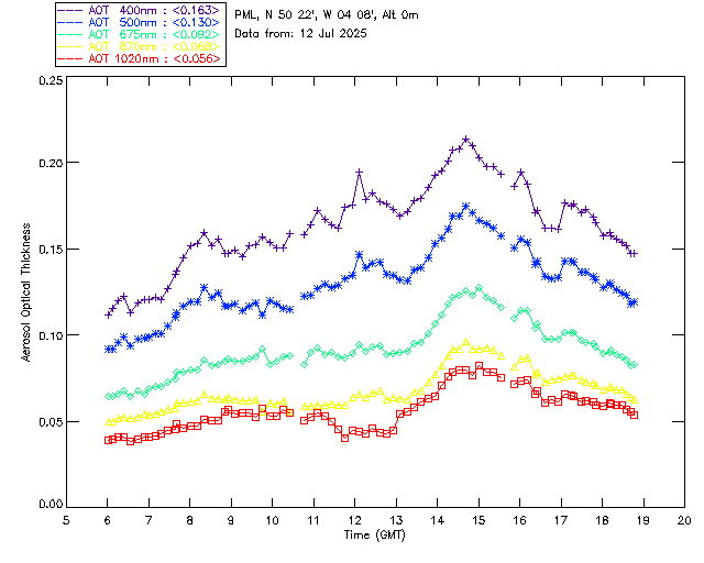In May 2001 a PREDE POM01-L was installed on the roof of the Plymouth Marine Laboratory to continue the atmospheric correction research of the PML Remote Sensing Group. This was to replace the AERONET CIMEL sunphotometer situated at Rame Head which was decommissioned in 1999. The instrument operates at 7 wavelengths (315, 400, 500, 670, 870, 940 and 1020nm) and scans at pre-set angles away from the solar disk to determine, using the inversion code of Nakajima et al. (2006), various properties of tiny particles called aerosols within the atmospheric column. From these measurements useful atmospheric aerosol parameters such as the Aerosol Optical Thickness (AOT), aerosol size distribution and single scattering albedo can be calculated. Marine aerosols tend to be bigger (D > 1µm) than those generated over the land (0.01 < D < 1µm) and are of a different chemical composition; marine aerosols are salt particles whereas terrestrial aerosols are sulphate compounds.