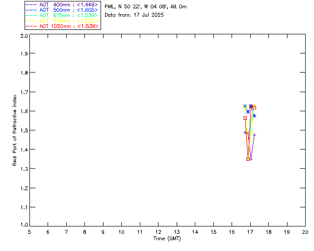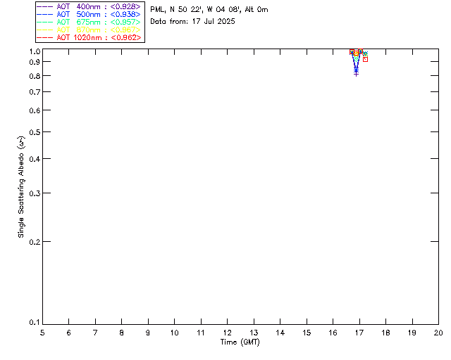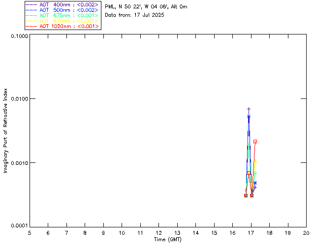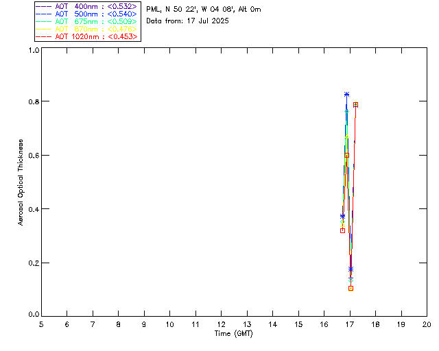 In May 2001 a PREDE POM01-L was installed on the roof of the Plymouth Marine Laboratory to continue the atmospheric correction research of the PML Remote Sensing Group. This was to replace the AERONET CIMEL sunphotometer situated at Rame Head which was decommissioned in 1999. The instrument operates at 7 wavelengths (315, 400, 500, 670, 870, 940 and 1020nm) and scans at pre-set angles away from the solar disk to determine, using the inversion code of Nakajima et al. (2006), various properties of tiny particles called aerosols within the atmospheric column. From these measurements useful atmospheric aerosol parameters such as the Aerosol Optical Thickness (AOT), aerosol size distribution and single scattering albedo can be calculated. Marine aerosols tend to be bigger (D > 1µm) than those generated over the land (0.01 < D < 1µm) and are of a different chemical composition; marine aerosols are salt particles whereas terrestrial aerosols are sulphate compounds.