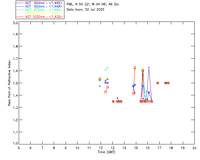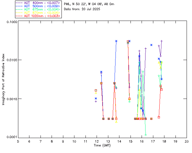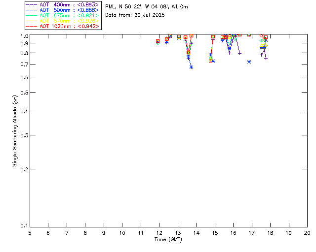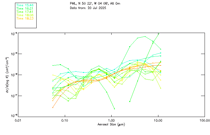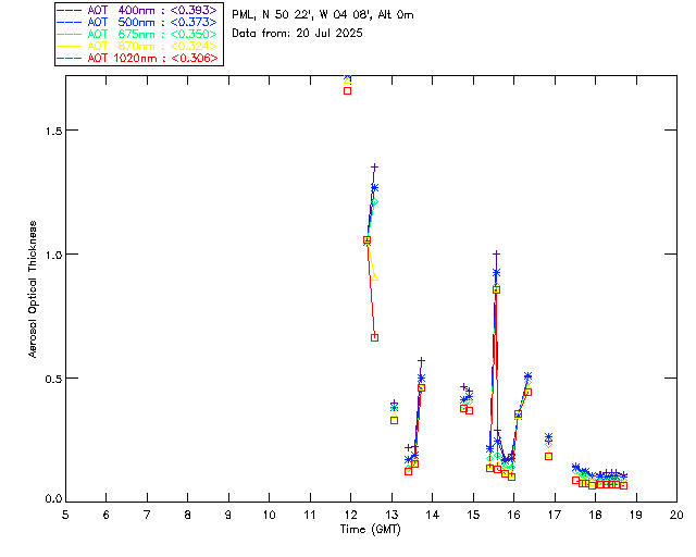 In May 2001 a PREDE POM01-L was installed on the roof of the Plymouth Marine Laboratory to continue the atmospheric correction research of the PML Remote Sensing Group. This was to replace the AERONET CIMEL sunphotometer situated at Rame Head which was decommissioned in 1999. The instrument operates at 7 wavelengths (315, 400, 500, 670, 870, 940 and 1020nm) and scans at pre-set angles away from the solar disk to determine, using the inversion code of Nakajima et al. (2006), various properties of tiny particles called aerosols within the atmospheric column. From these measurements useful atmospheric aerosol parameters such as the Aerosol Optical Thickness (AOT), aerosol size distribution and single scattering albedo can be calculated. Marine aerosols tend to be bigger (D > 1µm) than those generated over the land (0.01 < D < 1µm) and are of a different chemical composition; marine aerosols are salt particles whereas terrestrial aerosols are sulphate compounds.