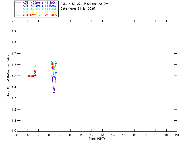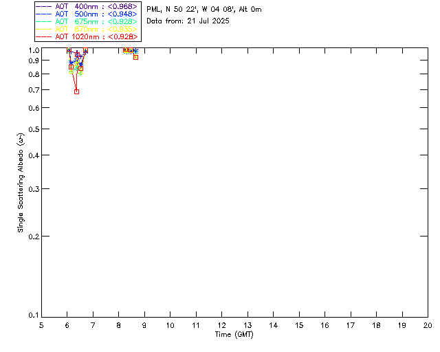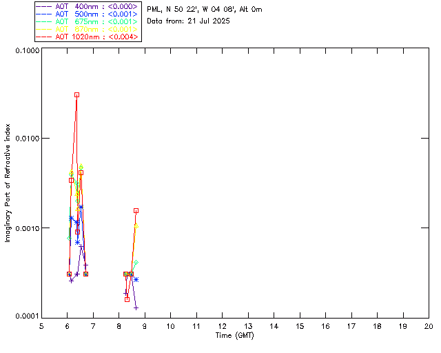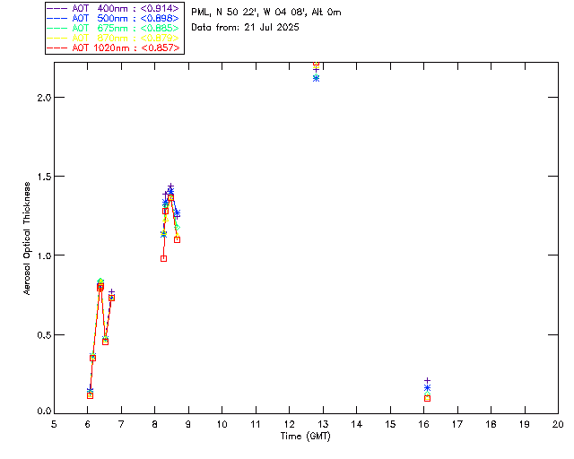 In May 2001 a PREDE POM01-L was installed on the roof of the Plymouth Marine Laboratory to continue the atmospheric correction research of the PML Remote Sensing Group. This was to replace the AERONET CIMEL sunphotometer situated at Rame Head which was decommissioned in 1999. The instrument operates at 7 wavelengths (315, 400, 500, 670, 870, 940 and 1020nm) and scans at pre-set angles away from the solar disk to determine, using the inversion code of Nakajima et al. (2006), various properties of tiny particles called aerosols within the atmospheric column. From these measurements useful atmospheric aerosol parameters such as the Aerosol Optical Thickness (AOT), aerosol size distribution and single scattering albedo can be calculated. Marine aerosols tend to be bigger (D > 1µm) than those generated over the land (0.01 < D < 1µm) and are of a different chemical composition; marine aerosols are salt particles whereas terrestrial aerosols are sulphate compounds.
