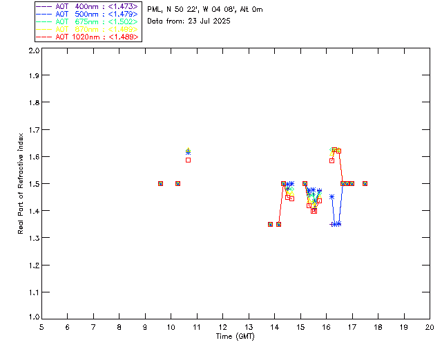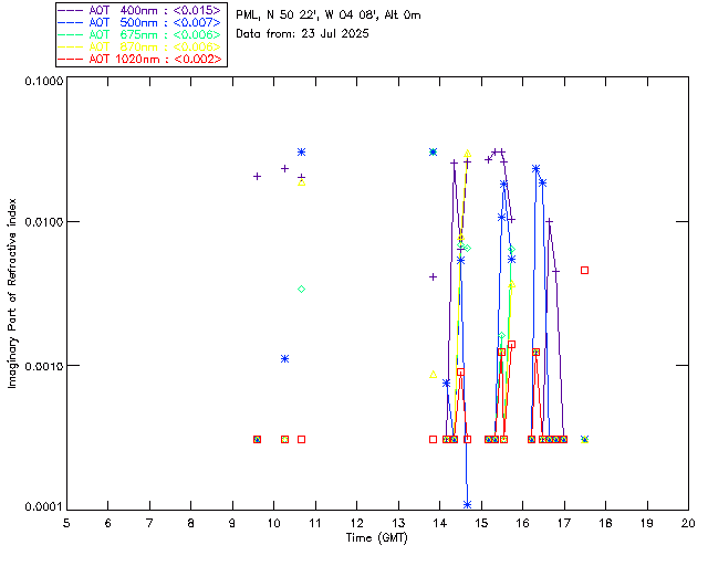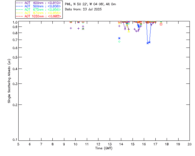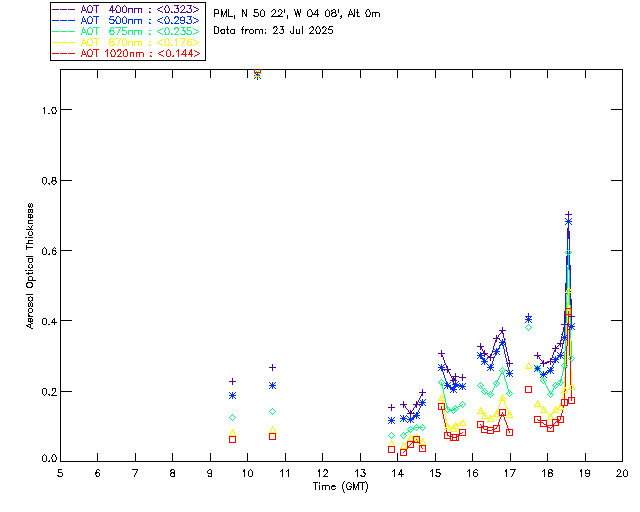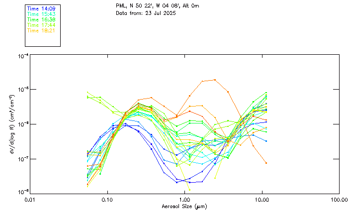 In May 2001 a PREDE POM01-L was installed on the roof of the Plymouth Marine Laboratory to continue the atmospheric correction research of the PML Remote Sensing Group. This was to replace the AERONET CIMEL sunphotometer situated at Rame Head which was decommissioned in 1999. The instrument operates at 7 wavelengths (315, 400, 500, 670, 870, 940 and 1020nm) and scans at pre-set angles away from the solar disk to determine, using the inversion code of Nakajima et al. (2006), various properties of tiny particles called aerosols within the atmospheric column. From these measurements useful atmospheric aerosol parameters such as the Aerosol Optical Thickness (AOT), aerosol size distribution and single scattering albedo can be calculated. Marine aerosols tend to be bigger (D > 1µm) than those generated over the land (0.01 < D < 1µm) and are of a different chemical composition; marine aerosols are salt particles whereas terrestrial aerosols are sulphate compounds.