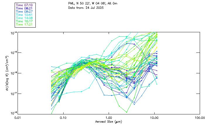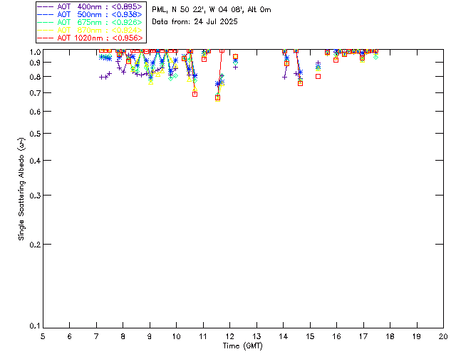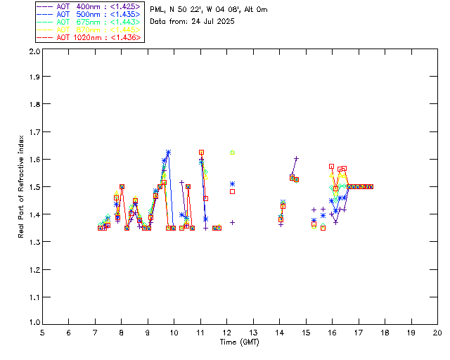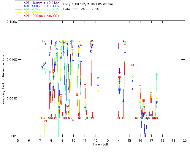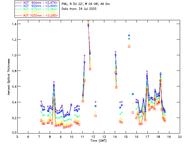 In May 2001 a PREDE POM01-L was installed on the roof of the Plymouth Marine Laboratory to continue the atmospheric correction research of the PML Remote Sensing Group. This was to replace the AERONET CIMEL sunphotometer situated at Rame Head which was decommissioned in 1999. The instrument operates at 7 wavelengths (315, 400, 500, 670, 870, 940 and 1020nm) and scans at pre-set angles away from the solar disk to determine, using the inversion code of Nakajima et al. (2006), various properties of tiny particles called aerosols within the atmospheric column. From these measurements useful atmospheric aerosol parameters such as the Aerosol Optical Thickness (AOT), aerosol size distribution and single scattering albedo can be calculated. Marine aerosols tend to be bigger (D > 1µm) than those generated over the land (0.01 < D < 1µm) and are of a different chemical composition; marine aerosols are salt particles whereas terrestrial aerosols are sulphate compounds.